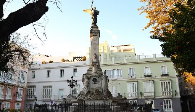 En 1918 una comisión del Ayuntamiento de Cádiz y de la Academia Hispano Americana impulsó el monumento por suscripción popular (con donaciones de españoles y americanos) para la erección de un grupo escultórico en homenaje y agradecimiento a D. Claudio López Bru, segundo Marqués de Comillas, (Barcelona 1853-Madrid 1925) Hijo Adoptivo de Cádiz, licenciado en derecho, heredero de unos de los holdings empresariales más importantes en la época en España (Compañía Trasatlántica, Astilleros de Matagorda) y gran filántropo.