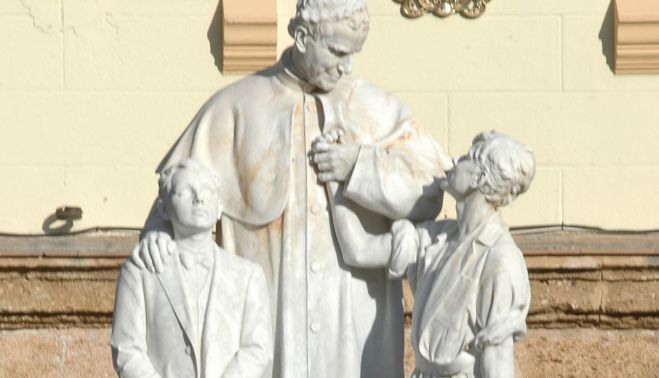 El santo se representa vestido con sotana y esclavina, detrás de dos figuras: un joven estudiante a su derecha de frente, con las piernas en contraposto, y la mirada suavemente inclinada hacia el cielo, vestido con pantalón y chaqueta con un libro abierto entre las manos; la mano derecha del Santo se apoya en el hombro derecho del estudiante; la otra figura, es un joven aprendiz, con los dos pies firmemente apoyados sobre el basamento, situado en diagonal con la figura del Santo, permite dirigir la atención hacia él y aparece vestido con bata de trabajo de taller, cogiendo con la mano izquierda una maza apoyada en el basamento, mientras su mano derecha se apoya en la de Don Bosco situada a la altura del corazón. La mirada sonriente de ambos personajes y las manos son elementos que permiten establecer la relación entre ambas figuras.