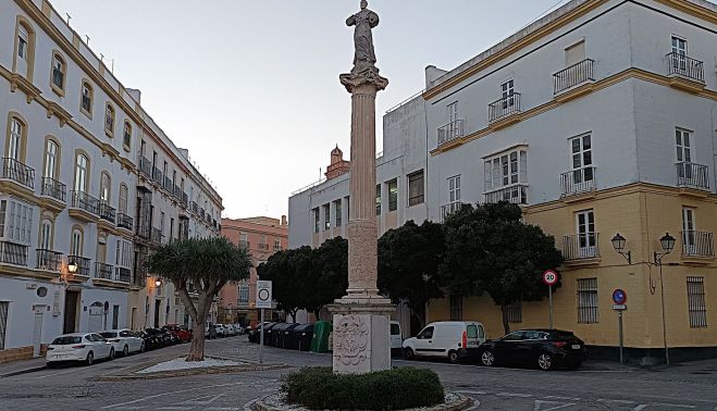 En los laterales se han colocado sendas leyendas inscritas en versales: “SE ERIGIÓ POR UOTO DE ESTA CIVDAD DE CADIZ ESTA COLUNA Y ESTATVA A S.N FRAN.CO XAVIER APOSTOL DE LAS YNDIAS COMO A VNO DE SUS PATRONOS. AÑO DE 1735. JHS”. En el lateral “DE LA CIVDAD”, sin mencionar Cádiz.