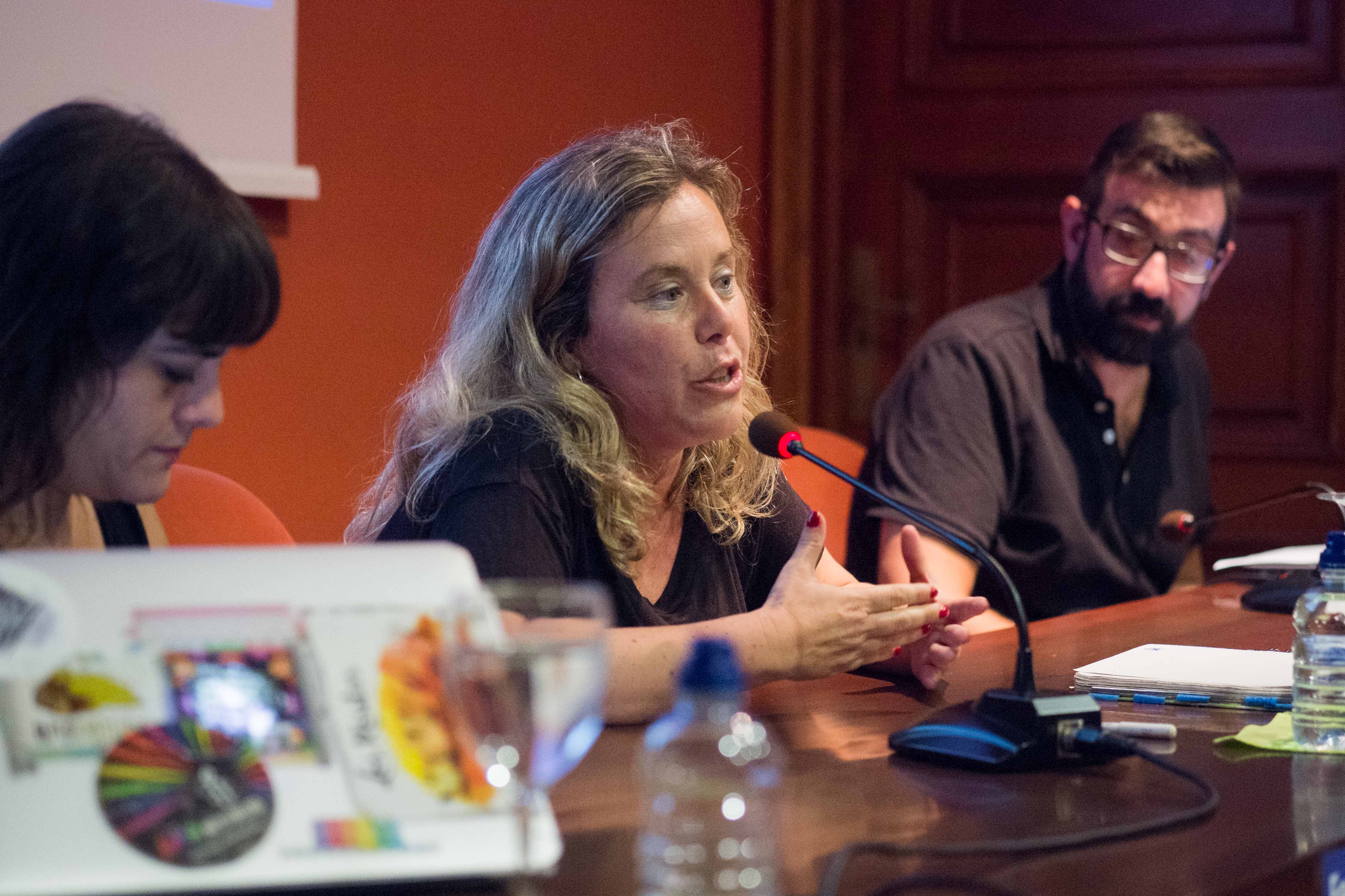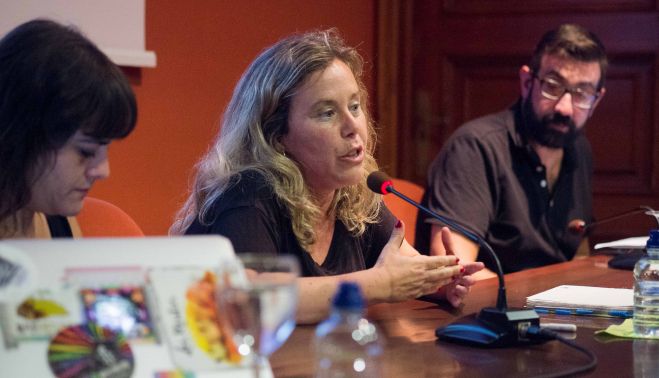 A lo largo del diálogo se habló de qué es la diversidad sexual y cómo se aborda en todos los ámbitos educativos. Begoña y Esperanza destacaron, en primer lugar, que existan foros como este festival, “espacios de construcción de pensamiento colectivo donde poder compartir experiencias de forma libre, espacios comunes de confluencia activista”. Según Esperanza, el concepto de diversidad sexual tiene que ir más allá de la dicotomía obligatoria sexo-género que nos han transmitido hasta ahora. La diversidad sexual abarcaría todo ese abanico de posibilidades que se salen de esa dicotomía clásica que sólo habla de macho/hembra, varón/mujer, y relaciones de heterosexualidad. Hay muchas personas que no encajan en este esquema. Para Begoña, es muy importante hablar de diversidades sexuales, en plural. Se trata de “transformar ese modelo binario y descubrir la infinita plasticidad de la sexualidad”. El sistema es heteronormativo, controla nuestros cuerpos a través de esas clasificaciones. Intentan configurar nuestras subjetividades con el rosa-azul. Debemos cambiar esa biopolítica para descubrir el violeta y la ilimitada gama de colores.