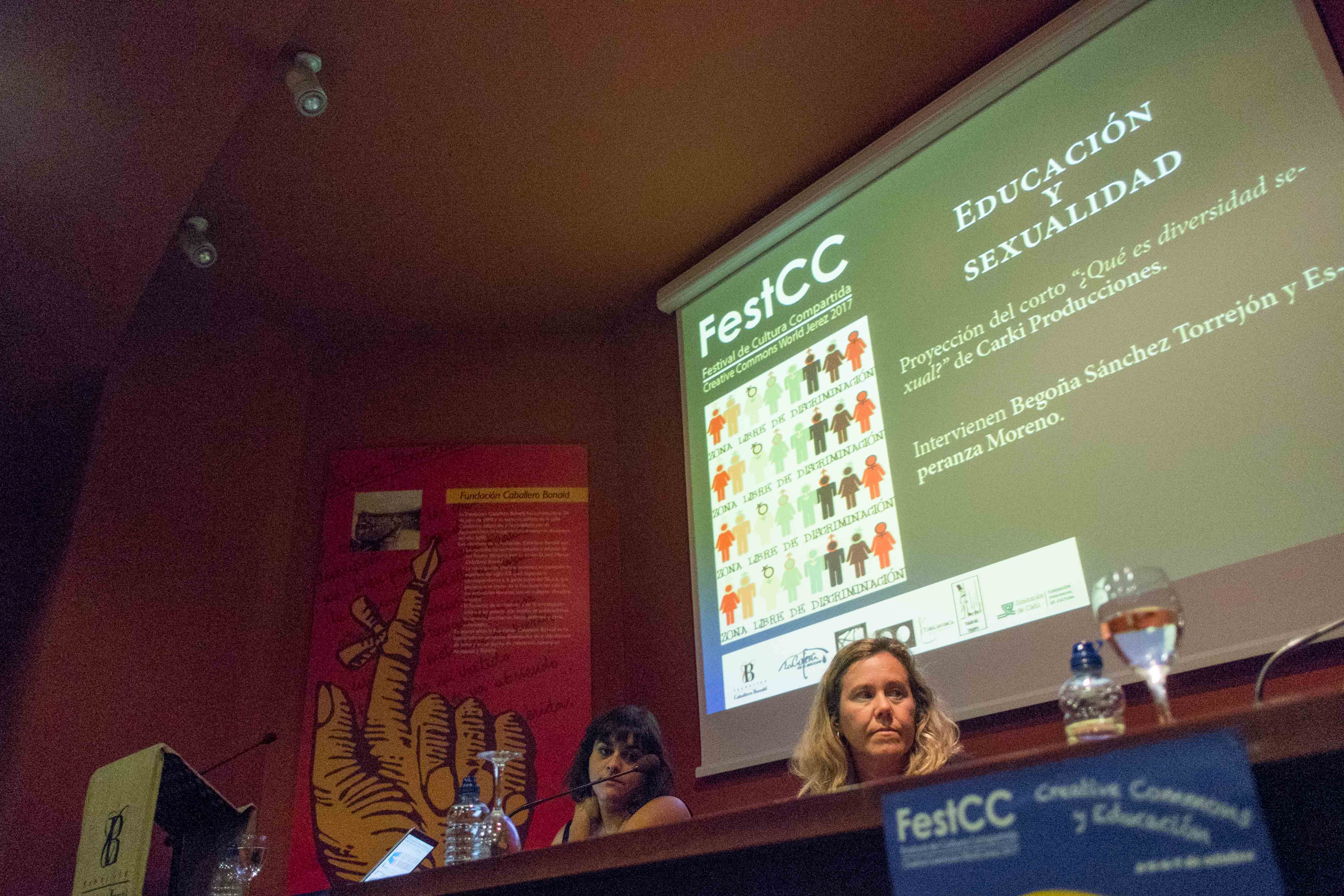 La sesión del jueves giró en torno a la diversidad sexual en la educación. José Ramón García, de Torrejoyanca-ID, fue el encargado de moderar el diálogo con Begoña Sánchez y Esperanza Moreno. Para enriquecer el debate, José Ramón proyectó un vídeo y mostró algunos ejemplos del abundante material creative commons que existe sobre el tema. Begoña Sánchez Torrejón es profesora en la UCA, en la Facultad de Ciencias de la Educación, en el departamento de Didáctica. Es doctora en Género, Identidad y Ciudadanía. Ha sido profesora invitada en universidades de Italia y Brasil. Esperanza Moreno Hernández es licenciada en Bellas Artes. Trabaja para la delegación de Igualdad de Arcos de la Frontera impartiendo talleres sobre diversidad afectivo- sexual. Su labor artística se ha volcado en proyectos sobre activismo feminista y lesbiano. También ha intervenido en el Máster de Género de la UCA. En colaboración con la Diputación y la asociación Arco Iris LGBTI+, desarrolla actividades formativas en varias localidades de nuestra provincia.
