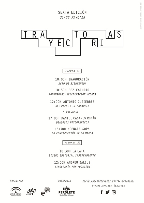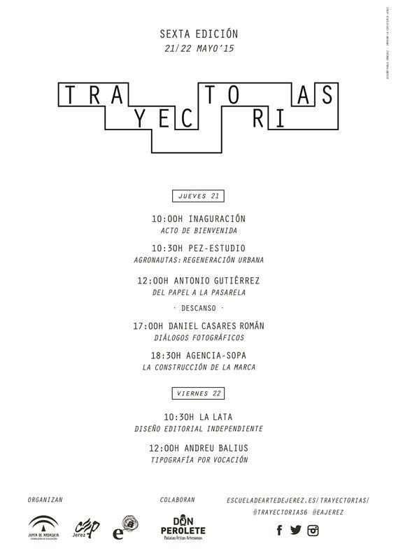 La Escuela de Arte de Jerez junto con la colaboración del Centro de Profesores de Jerez, acoge durante los días 21 y 22 de mayo la sexta edición de las jornadas de diseño y comunicación visual Trayectorias. La programación de este año incluye un ciclo de conferencias en el que se abordarán diferentes temas, enfoques de diseño y exposiciones de ámbito artístico. Esta iniciativa, que cuenta ya con seis ediciones, fue creada en 2010 ante la necesidad de enseñar el diseño gráfico a todos los sectores implicados en esta actividad, una cita que sirve para convertir a la Escuela de Arte en un centro educativo artístico de referencia para toda Andalucía.