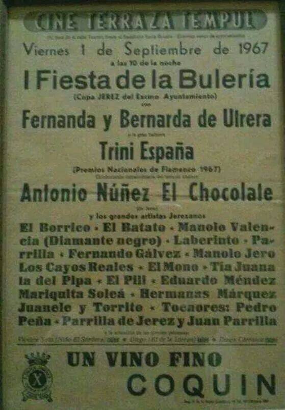Como rasgo identatario del certamen, Juan de la Plata decidió dedicarlo a la bulería y reflejar, en el modo que fuera posible, una de las tantas fiestas que surgían en los patios de vecinos de San Miguel o Santiago. Pudo llamarse la Gran Fiesta Jerezana, pero acabó con la denominación actual de Fiesta de la Bulería. El primer cartel lo formaron: El Borrico, Diamante Negro, Tío Parrilla, Paco Laberinto, Fernando Gálvez, Manuel Jero, José Vargas “El Mono”, El Pili, Tía Juana la del Pipa, María Soleá, las hermanas Márquez, Tomás Torre, Juanele Bermúdez, Vicente Soto, Diego Carrasco, Diego de la Margara, Pedro Peña y Manuel y Juan Parrilla. Algunos dicen que como aliciente a los artistas se instauró la Copa Jerez en la Fiesta pero no es así, más bien era que el ganador de la Copa actuaba como artista invitado en la Fiesta de la Bulería. Así ocurrió con la primera que correspondió al Borrico, y las siguientes que fueron a parar fue a parar a las manos de intérpretes de la talla de Terremoto o El Chozas, entre otros muchos. En la actualidad no ha sobrevivido este galardón.