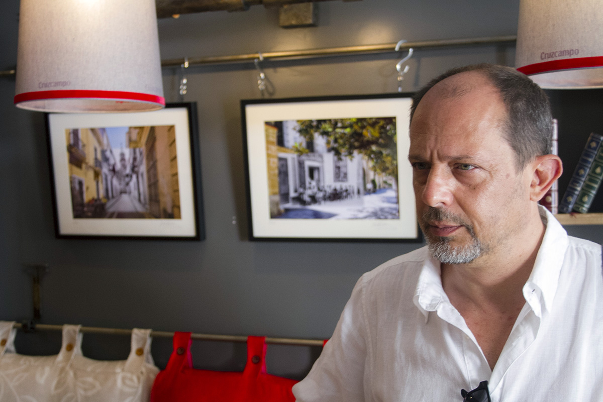 Fotógrafo de los denominados freelance, expone estos días en el restaurante Torre de la Vela, de plaza Plateros, su exposición fotográfica Jerez, ayer y hoy en la que muestra el Jerez pasado fundido con el presente a través de una técnica llamada refotografía, aunque él prefiere decir que sus fotografías son “arqueológicas”.