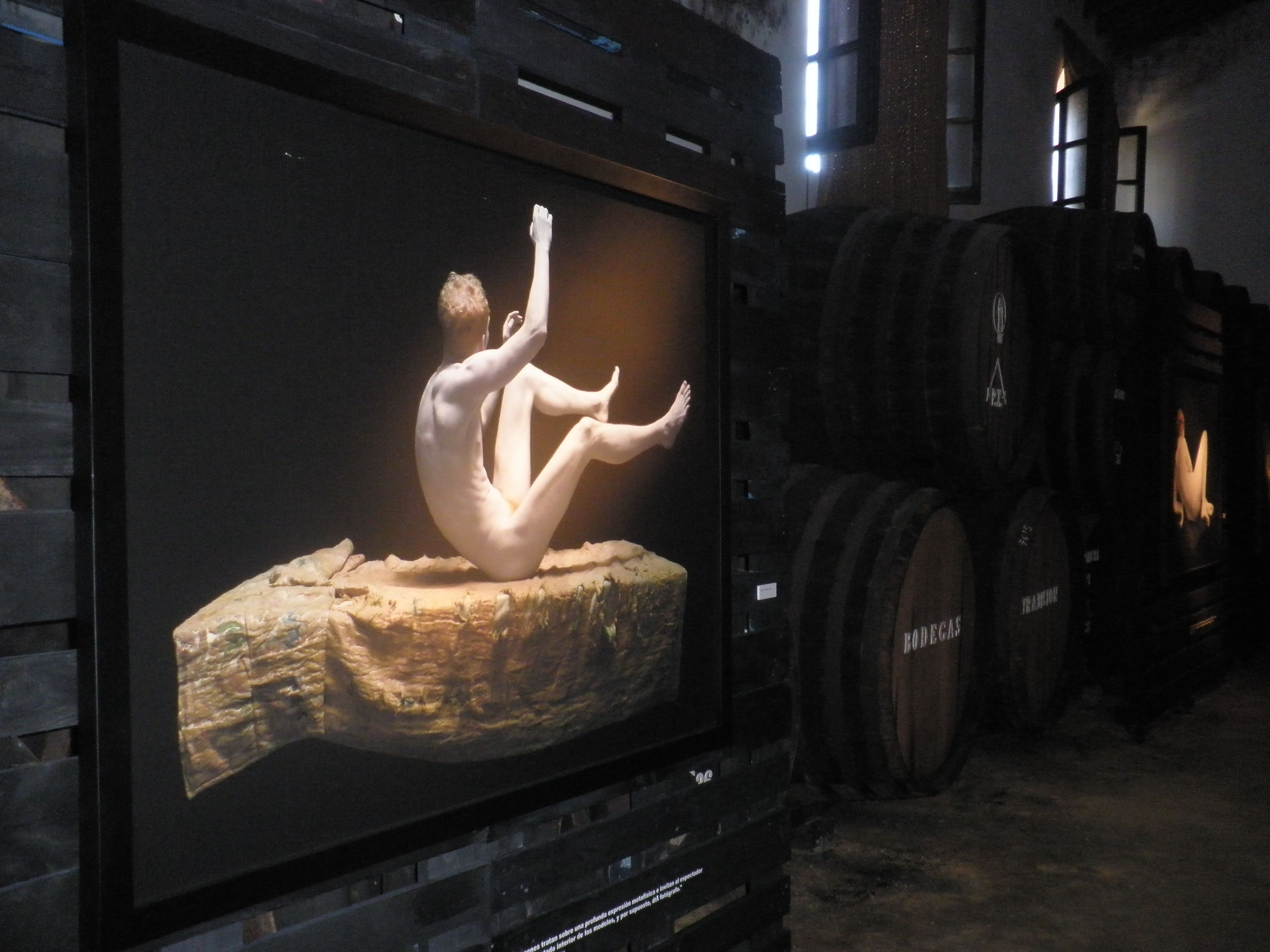 En el caso de los desnudos esa reflexión estalla en varias direcciones. Es un tipo de fotografía que utiliza recursos pictóricos para generar sensaciones y emociones. En este caso, la penumbra de la bodega y el aroma fuerte del vino potencian esas sensaciones. La textura de la piel se funde con la luz que atraviesa los ventanales. Y la iluminación parcial, con el fondo oscuro de los toneles, perfila la anatomía de los cuerpos con mayor contundencia. Las posturas de los cuerpos transmiten la vitalidad y la inquietud que impregnan a cualquier ser humano. Son posiciones naturales porque reflejan estados de ánimo de carne y hueso: los cuerpos caen, se arrastran, se retuercen, quizás de dolor, placer o miedo. Y los roedores albinos recorren la geografía blanca para recordarnos nuestra condición animal, trágica.