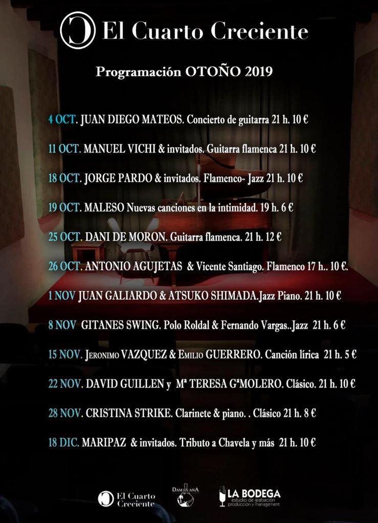 El conocido café bar de la calle Francos Damajuana, que en 2017 cumplió su vigésimo aniversario, inaugura en su interior un espacio escénico que, con un aforo reducido de 45 butacas, albergará durante todo el otoño conciertos íntimos de jazz, flamenco y música clásica. La iniciativa, que parte de la propia relación con el emblemático estudio de grabación, producción y management La Bodega, persigue ofrecer una variada oferta cultural a la ciudad de forma prolongada en el tiempo. Para ello nace, El Cuarto Creciente, una sala que es al mismo tiempo una asociación cultural presidida por el músico jerezano Melchor Campuzano en compañía de Luis Román, actual director de la Banda Municipal de Música.