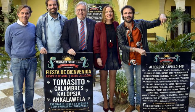 El teniente de alcaldesa de Urbanismo, Dinamización Cultural, Patrimonio y Seguridad, Francisco Camas, junto a la diputada provincial de Empleo, Ana Carrera, el director del Primavera Trompetera Festival, Miki Gutiérrez, el responsable del área de Incidencia y Comunicación de la Comisión Española de Ayuda al Refugiado, José Carlos Cabrera y el Canijo de Jerez, ha presentado la quinta edición del Primavera Trompetera Festival que tendrá lugar en el Circuito de Jerez Ángel Nieto, del 11 al 13 de abril.