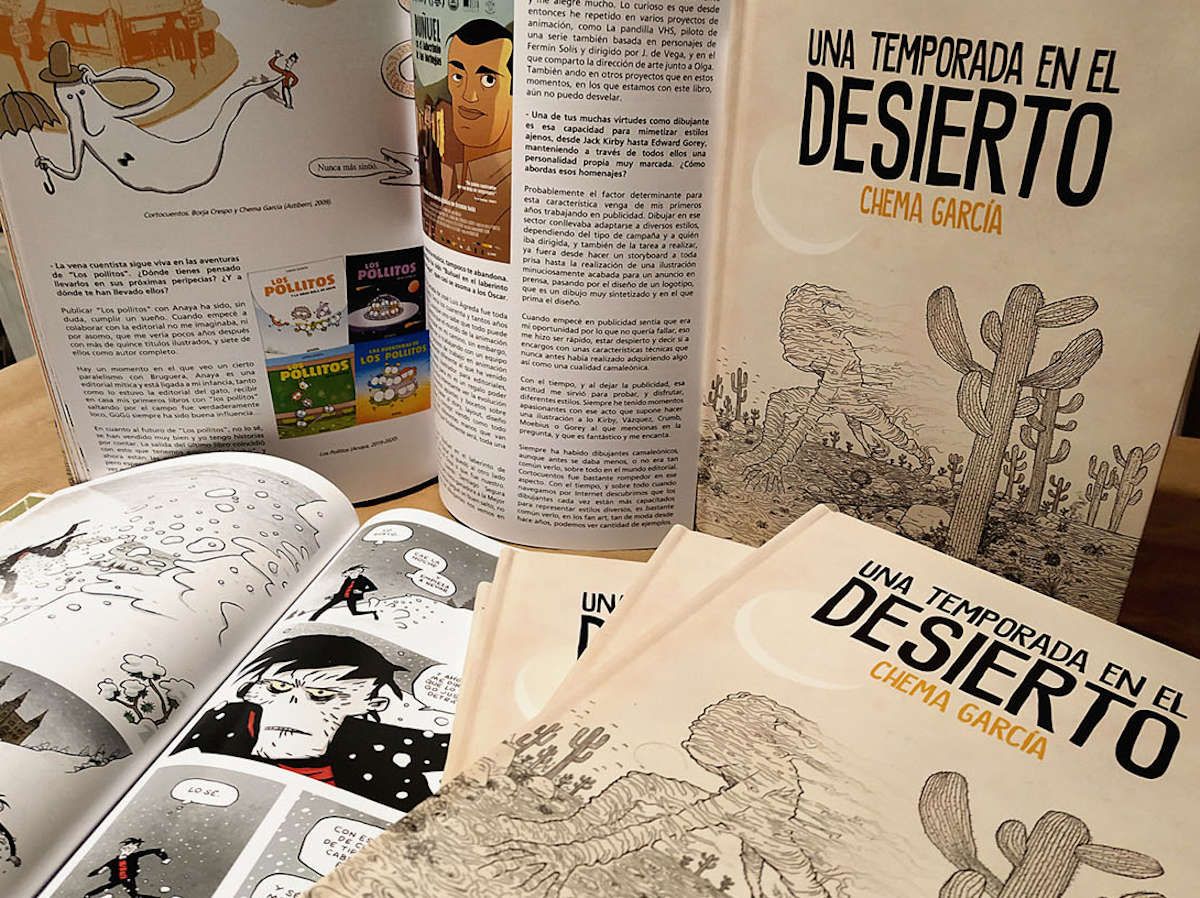 A lo largo de toda su trayectoria, el dibujante Chema García (Granada, 1973) ha hecho tebeos, ilustrado libros, trabajado en animación y diseñado en innumerables proyectos en los que ha tenido que adaptarse rápidamente a diversos estilos. Sin embargo, su nuevo libro Una temporada en el desierto de la Editorial Karras es un colección de historias, dibujos e ilustraciones sin planificación, sin encargos, aparecidas en distintas publicaciones a lo largo de los últimos veinte años y en las que el autor ha sido mucho más libre y puede verse su impronta y estilo más personales. Cada página de esta obra gráfica es un momento de evasión para expresarse libremente y un reflejo del lado más desenfadado y gamberro de este ilustrador todoterreno.