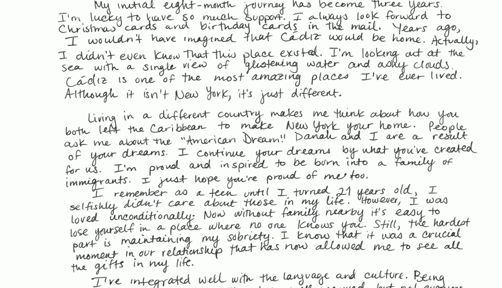 Como la magia del proyecto, puesto que a pesar del contacto que los migrantes puedan tener con su familia por redes sociales, esta carta personal e íntima es en muchas ocasiones un testimonio de auténtico amor. “Querida hermanita. Te escribo esta carta para decirte que te extraño a diario. Tenemos Facebook, Whatsapp, todas las tecnologías, pero no es lo mismo. Mi mayor deseo es abrazarte en persona y contarte todas mis cosas como lo hacíamos antes”, le dice la boliviana María Tania Lipacho a su hermana.