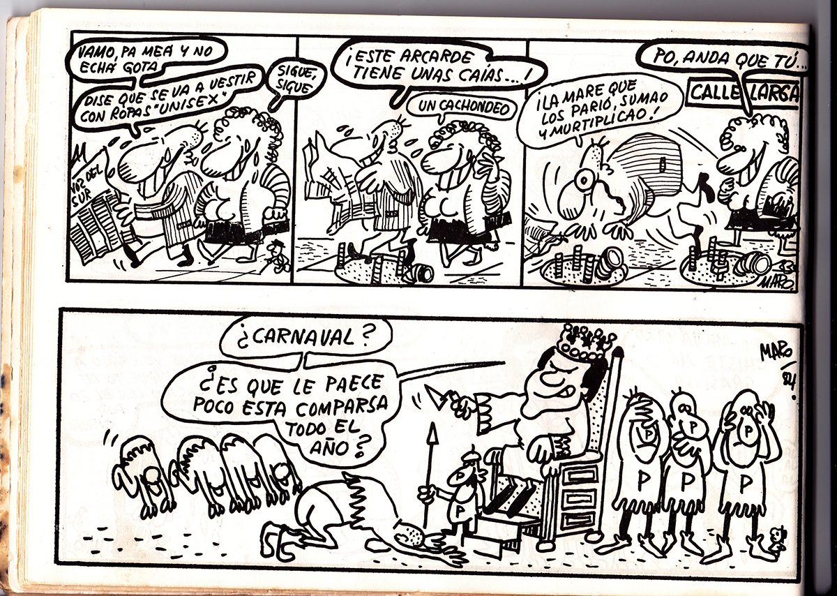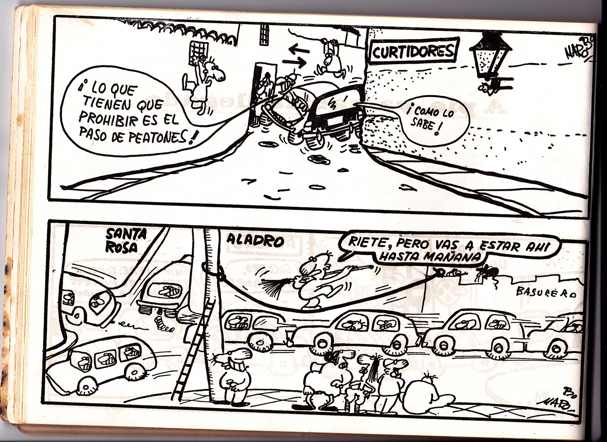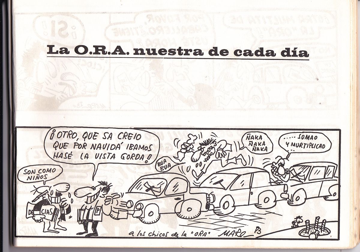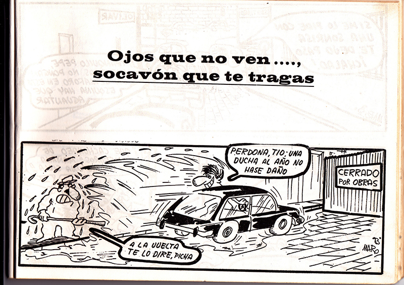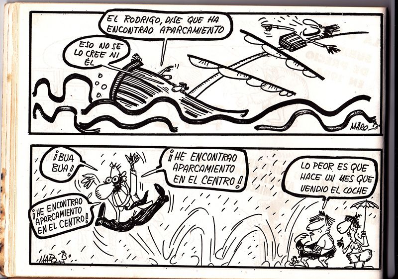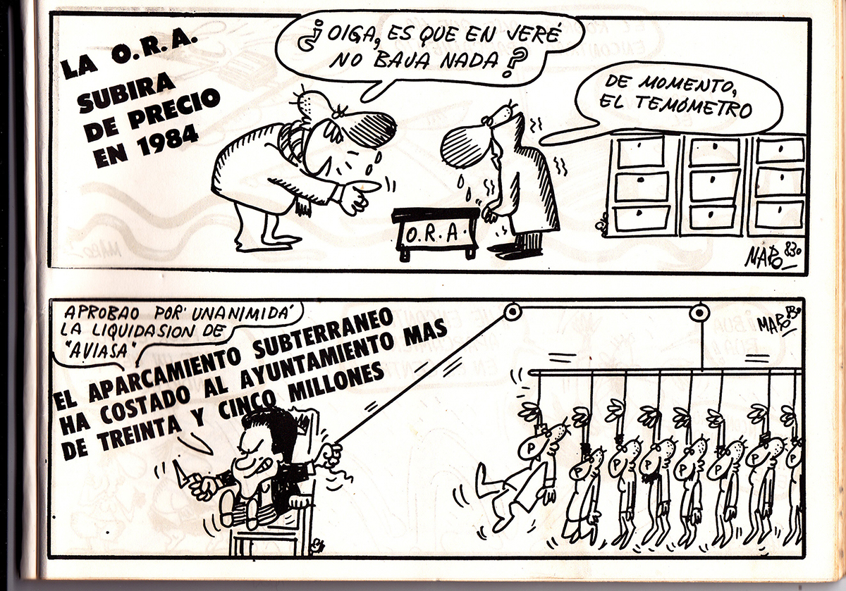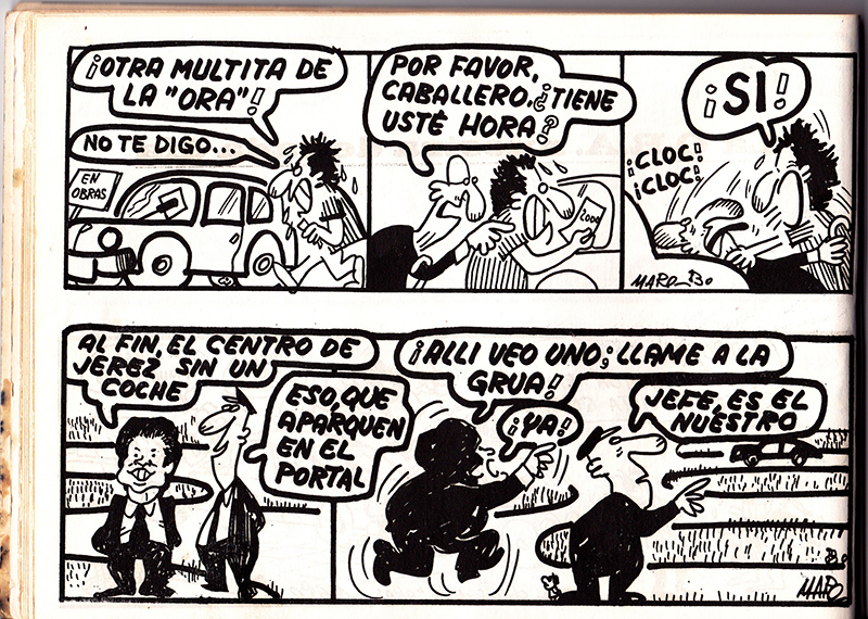 Continuamos con las tiras de Maro en La Voz del Sur, publicadas en el año 1984. En esta segunda entrega percibimos con tono humorístico algunos de los grandes problemas que sufría Jerez en los 80 y que pese a los grandes cambios urbanísticos que ha padecido siguen siendo una realidad: los atascos, las horas punta y las subidas del ORA. La Ordenanza Reguladora de Aparcamiento ya era un tema recurrente en los primeros años de gobierno de Pedro Pacheco. Sobre este, precisamente, se suceden las viñetas sarcásticas: la 'P' está presente en muchos de los personajes jerezanísimos de Maro.