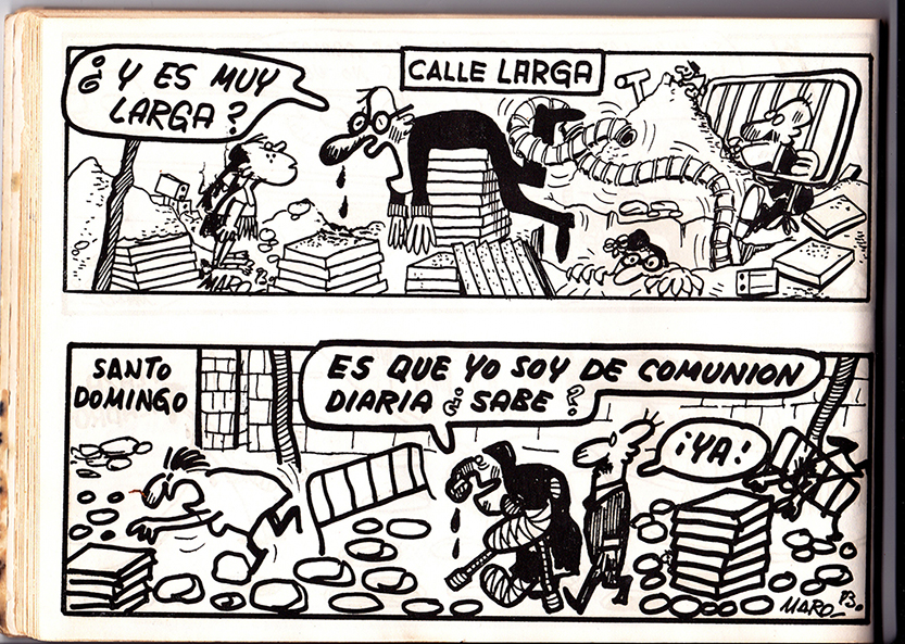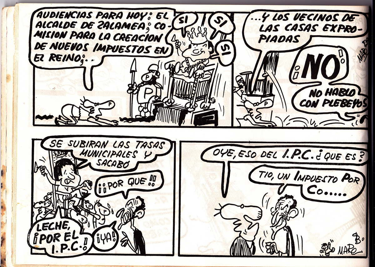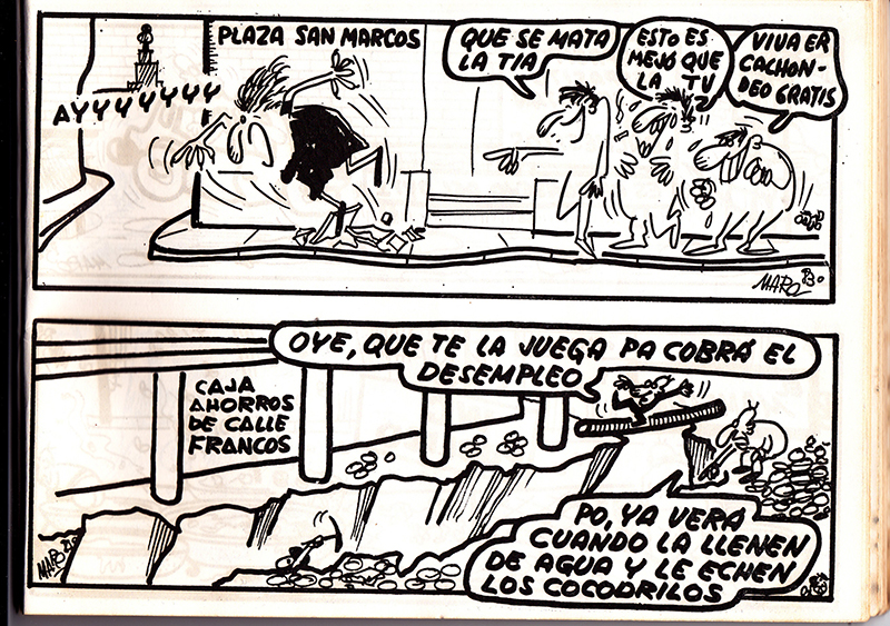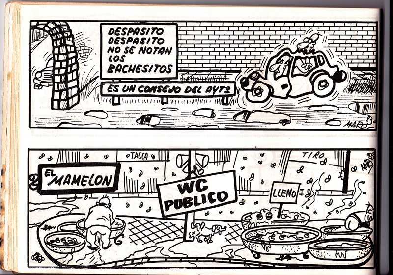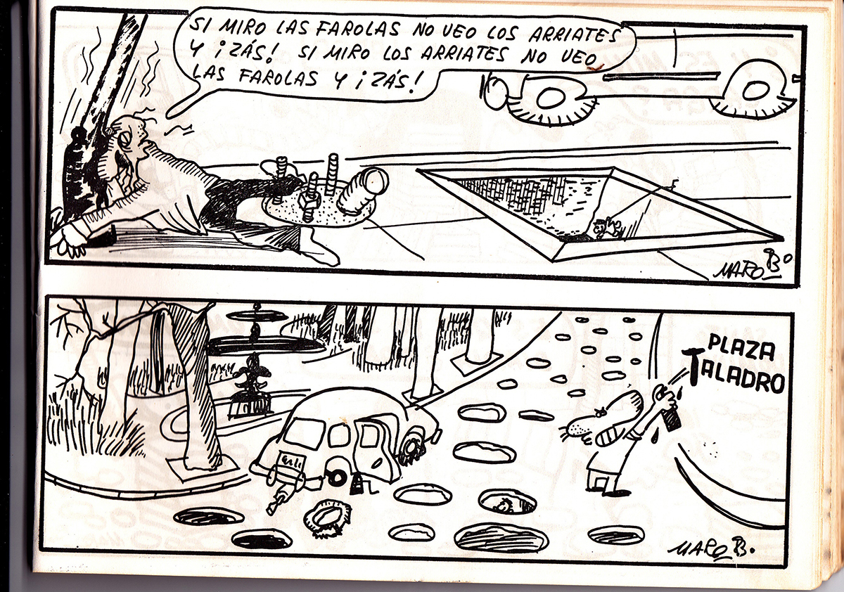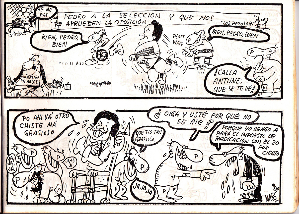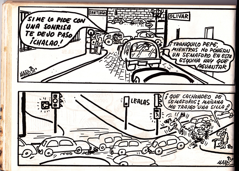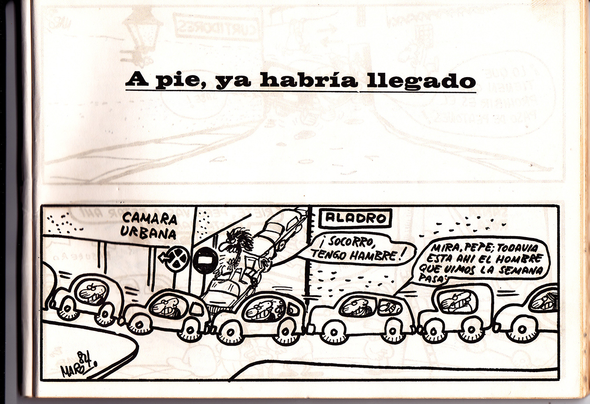 Continuamos con las tiras de Maro en La Voz del Sur, publicadas en el año 1984. En esta segunda entrega percibimos con tono humorístico algunos de los grandes problemas que sufría Jerez en los 80 y que pese a los grandes cambios urbanísticos que ha padecido siguen siendo una realidad: los atascos, las horas punta y las subidas del ORA. La Ordenanza Reguladora de Aparcamiento ya era un tema recurrente en los primeros años de gobierno de Pedro Pacheco. Sobre este, precisamente, se suceden las viñetas sarcásticas: la 'P' está presente en muchos de los personajes jerezanísimos de Maro.