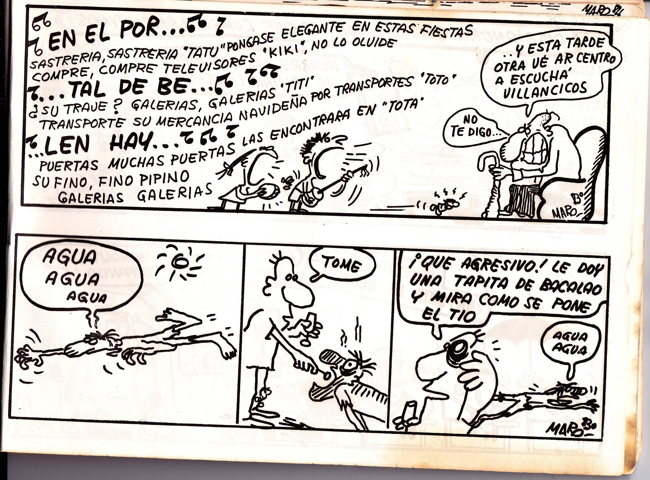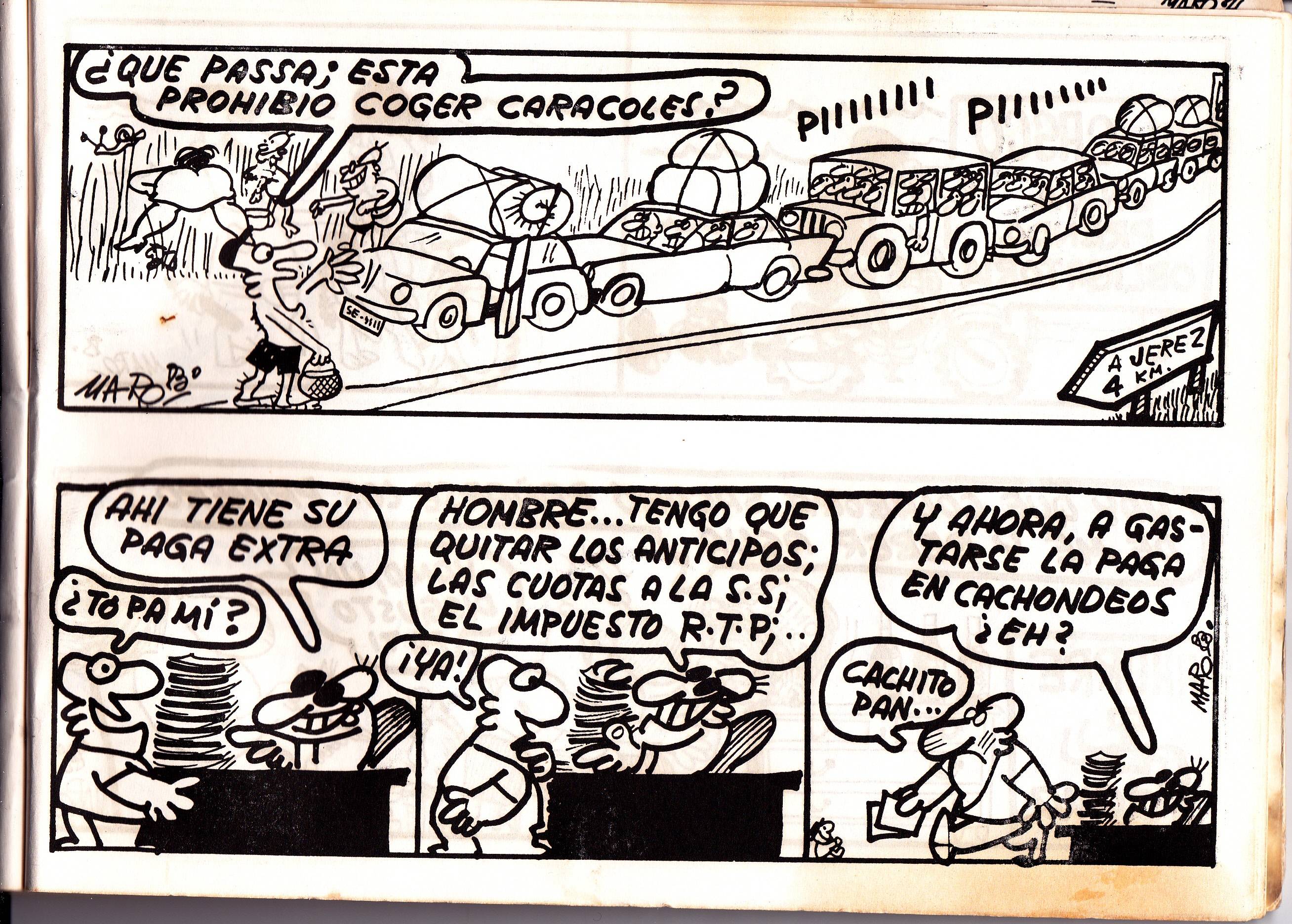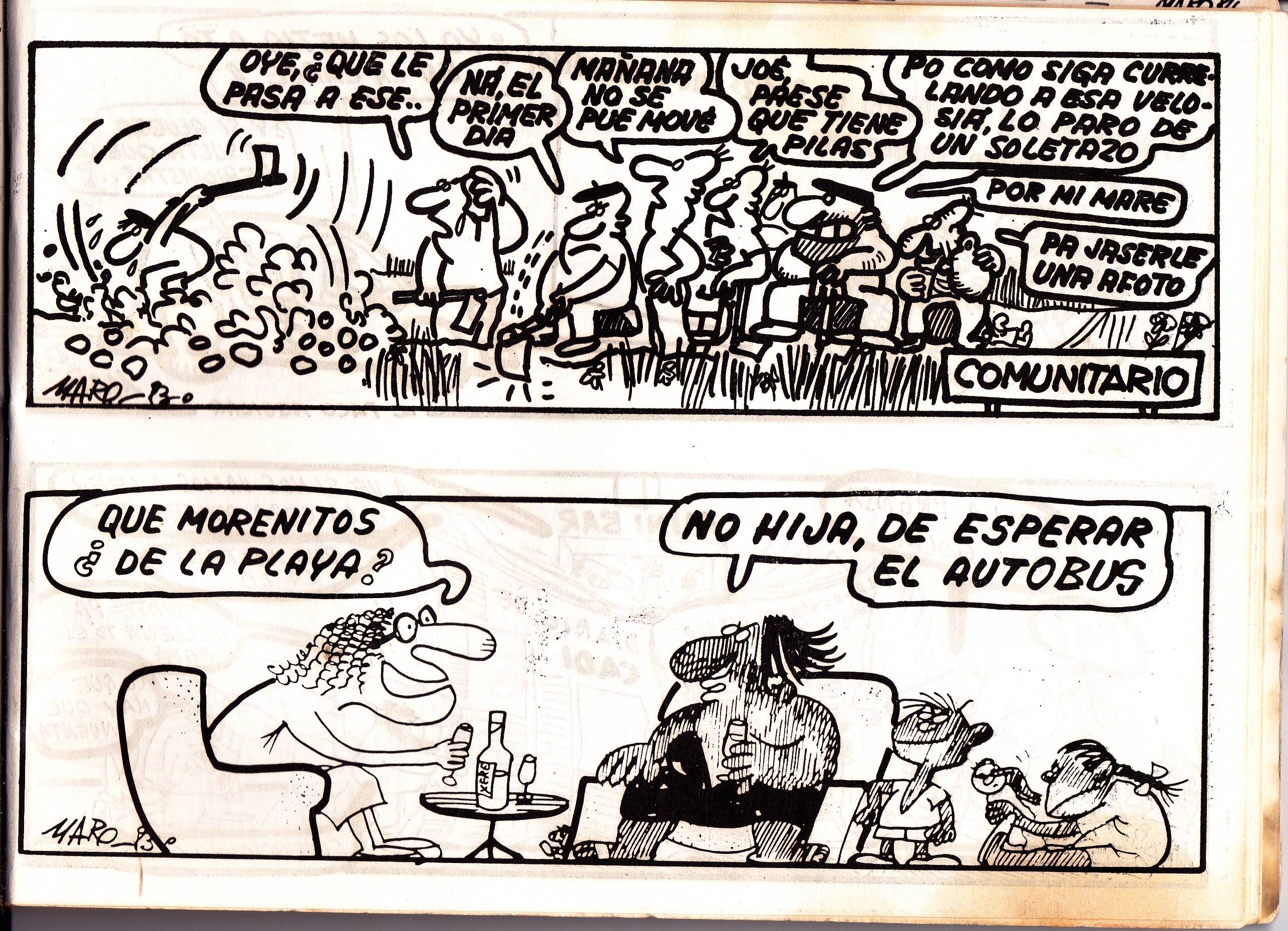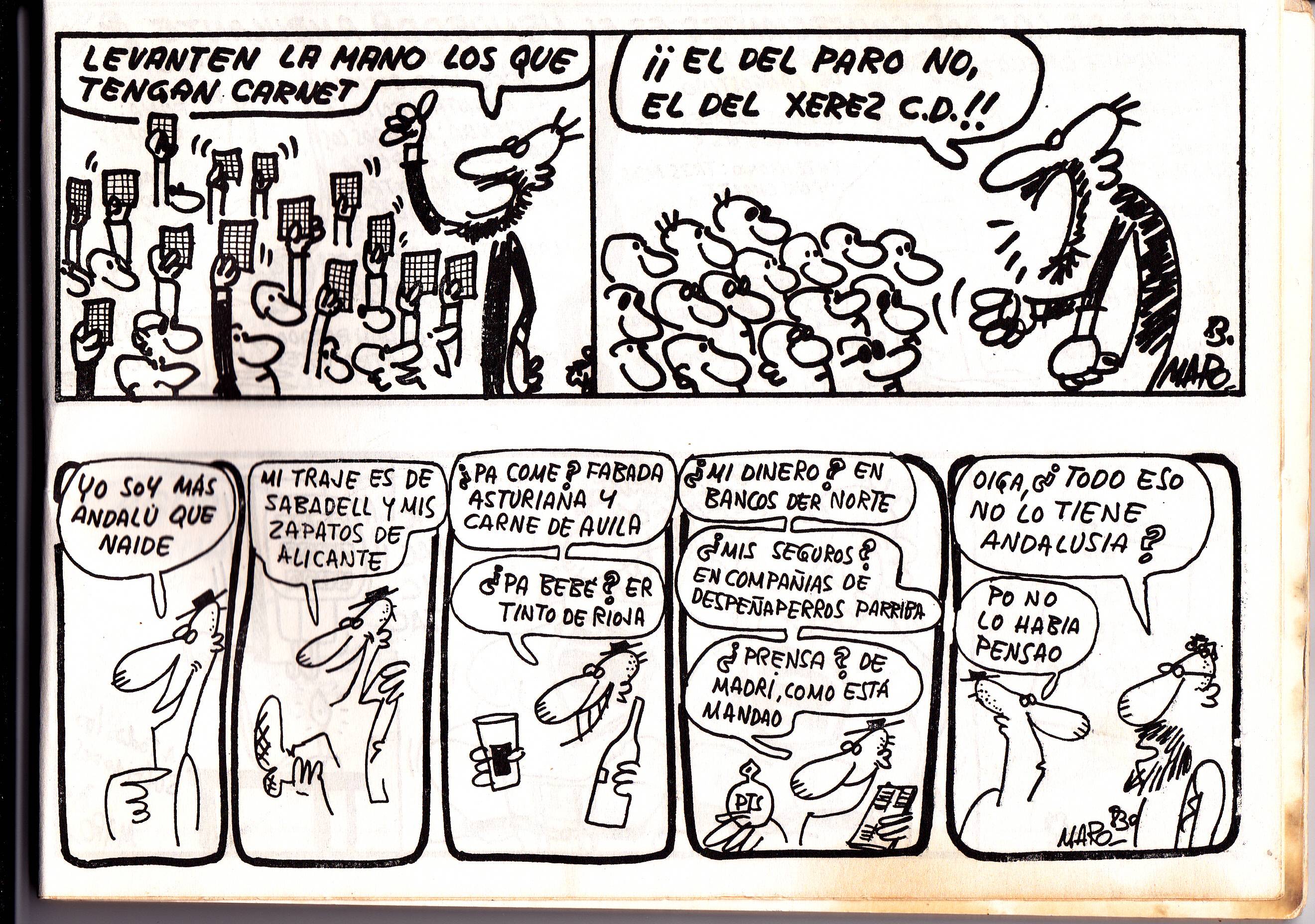 Terminamos la publicación de Las tiras de Maro en La Voz del Sur: Jerez en 1984 con estas últimas páginas en las que encontramos sátiras de sorprendente actualidad. Andaluces levantad... vuestro carné del paro. Y si es para ir a ver al Deportivo —ya no sabemos a cuál— pues también.