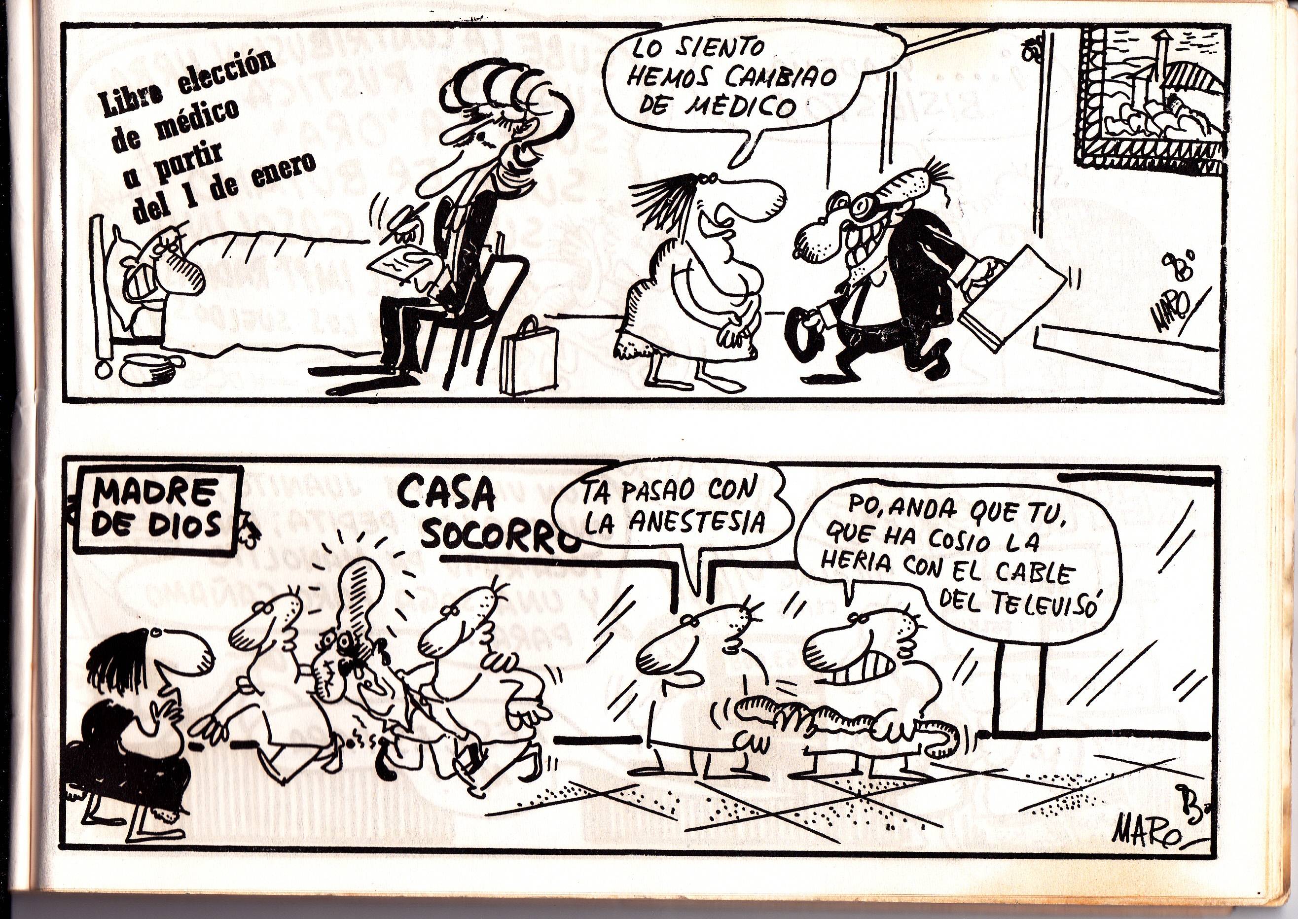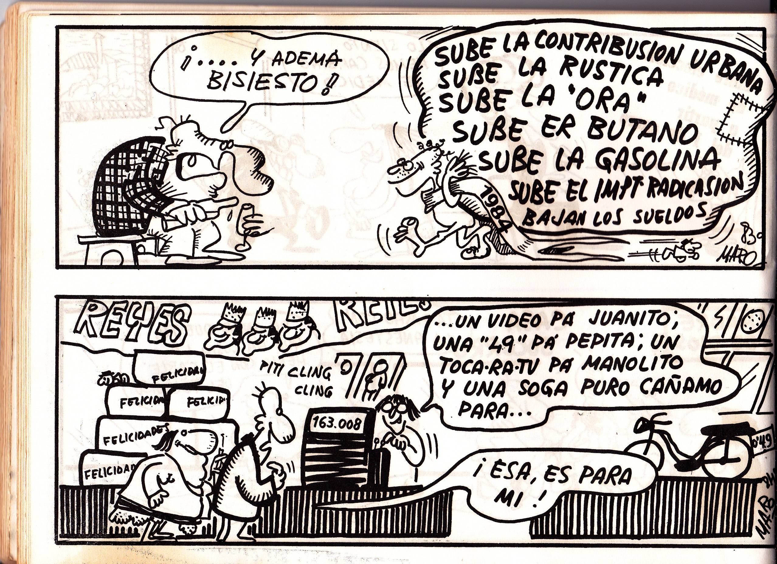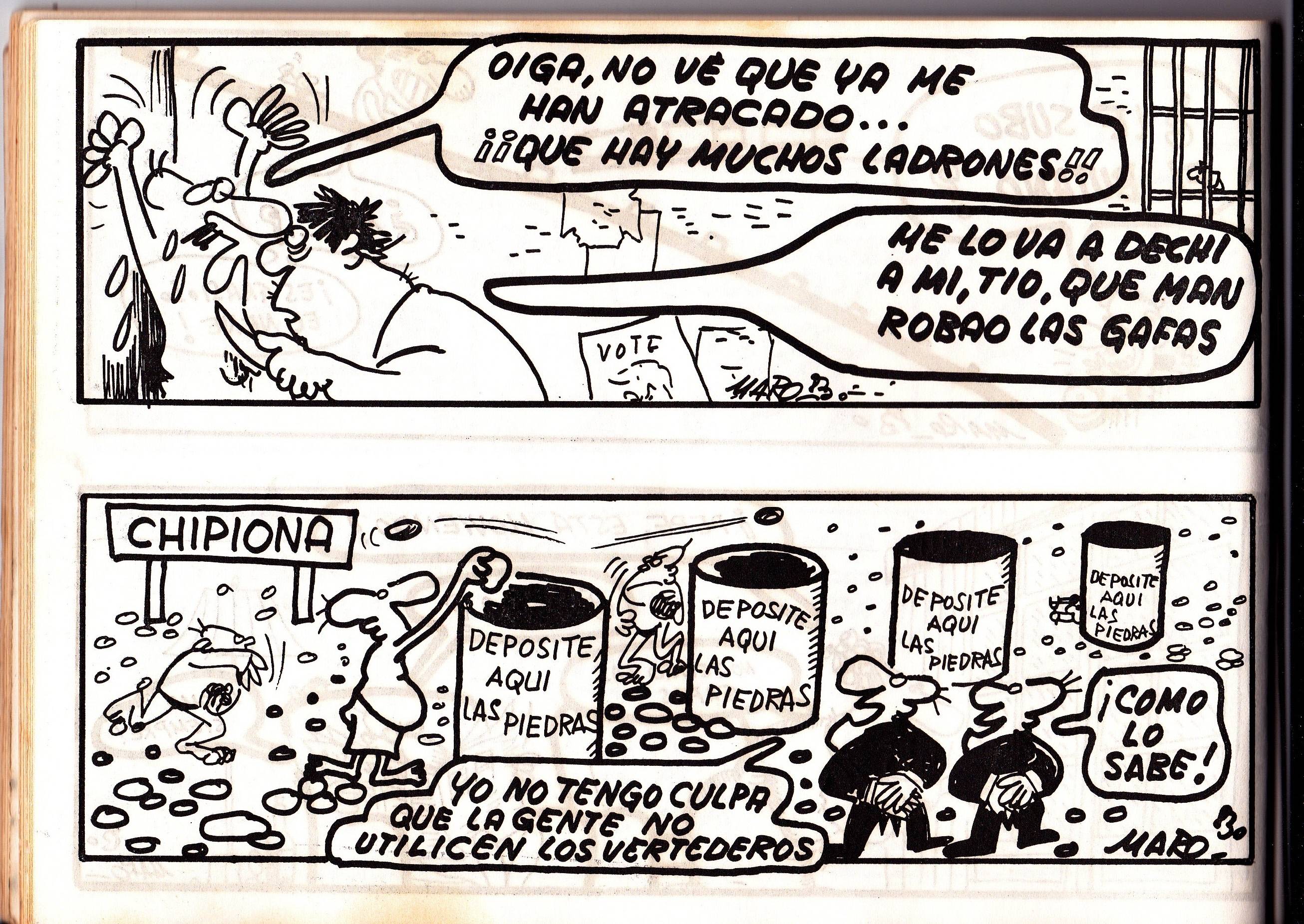 Terminamos la publicación de Las tiras de Maro en La Voz del Sur: Jerez en 1984 con estas últimas páginas en las que encontramos sátiras de sorprendente actualidad. Andaluces levantad... vuestro carné del paro. Y si es para ir a ver al Deportivo —ya no sabemos a cuál— pues también.