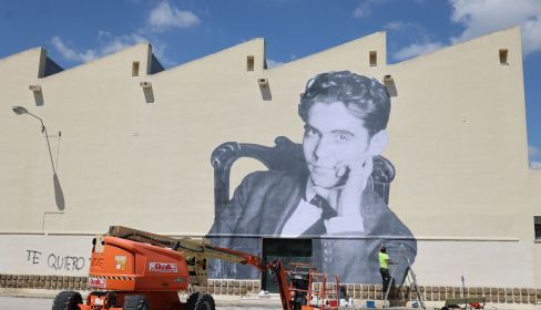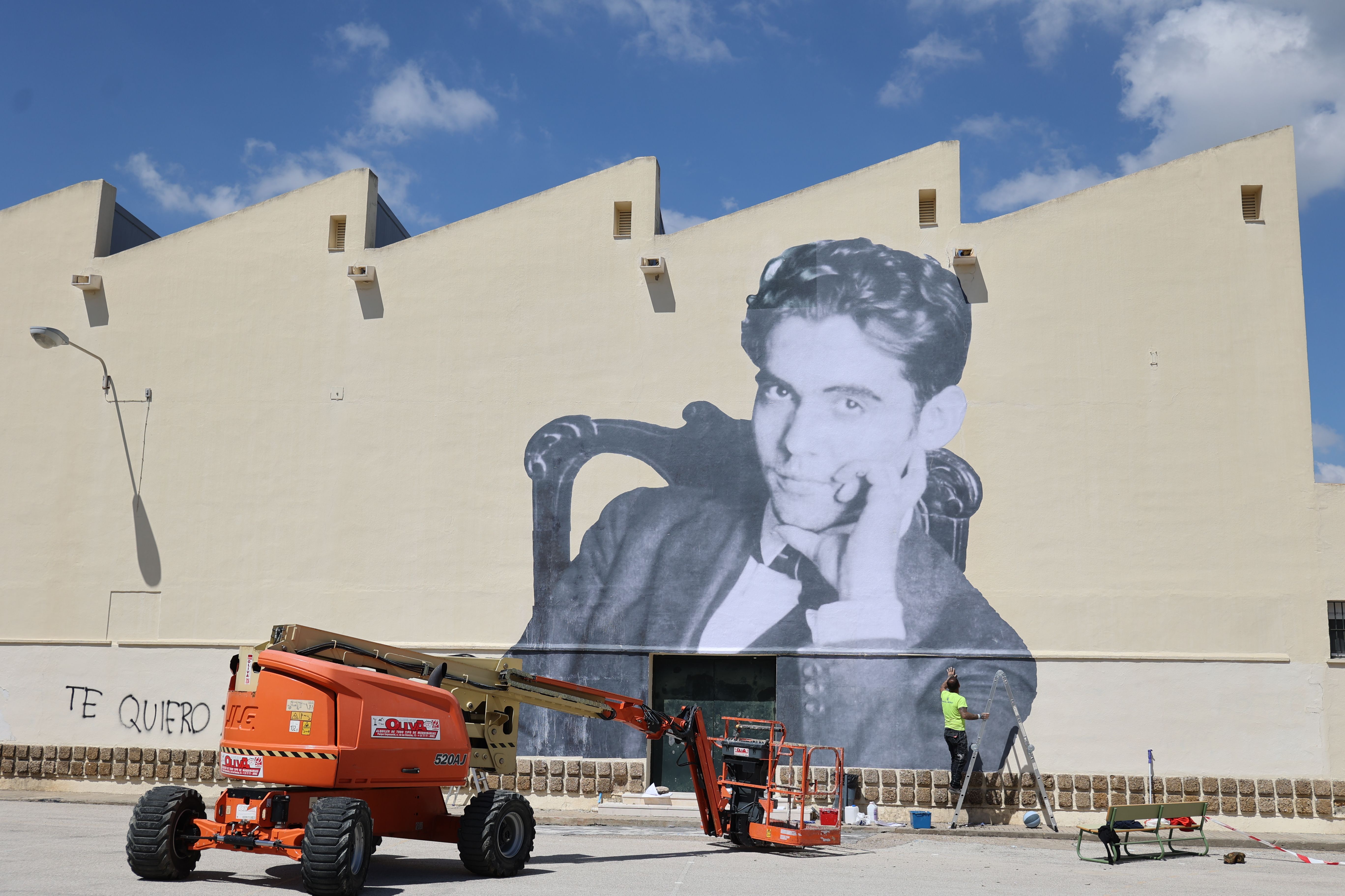 Com 8,5 metros de alto y 9,5 metros de ancho, el imponente fotomural de Lorca rescata la imagen más icónica del poeta granadino, que Toro ha tenido que adaptar para poder reproducirla a gran escala. “He tenido que trabajar con nuevas técnicas de Photoshop para rescatar la imagen, no hay buenos retratos de Lorca y este es el más conocido”, reseña.