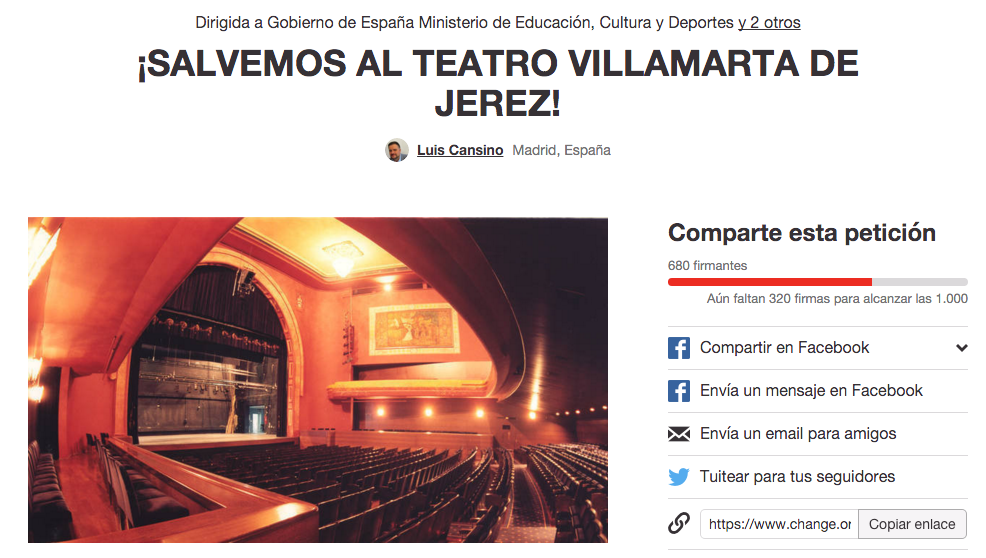 El prestigioso barítono de origen gallego Luis Cansino ha abierto una recogida de firmas en la web change.org dirigida al Ministerio de Educación, Cultura y Deportes; a la Consejería de Cultura de la Junta de Andalucía; y al Ayuntamiento de Jerez para "salvar al Teatro Villamarta de Jerez". Después de que lavozdelsur.es haya publicado la situación crítica en la que se encuentra la fundación que gestiona el coliseo jerezano, con un desequilibrio financiero que le llevará a su disolución en apenas quince días si antes no se resuelve por las administraciones públicas.