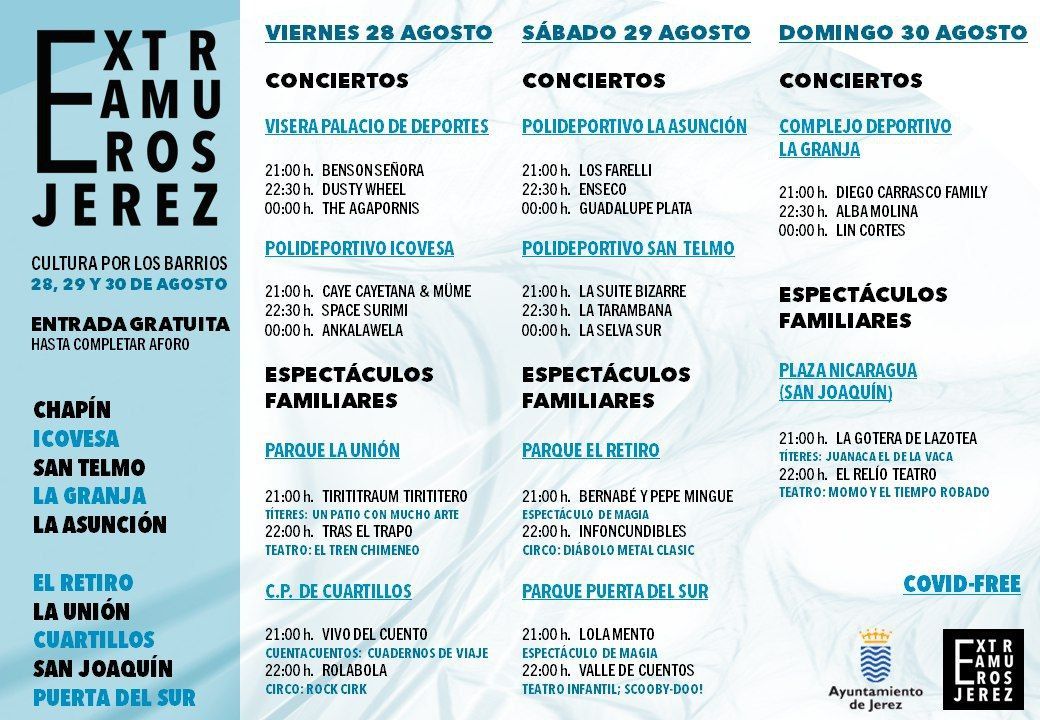 La cultura, especialmente la música, inundará prácticamente toda la ciudad durante el próximo fin de semana del 28 al 30 de agosto. En sustitución de la cuarta edición del festival Intramuros, que organiza el Ayuntamiento de Jerez a iniciativa de Izquierda Unida desde el pasado mandato, el covid ha provocado que la propuesta se reformule como Extramuros Jerez, un festival de cultura por los barrios que ofrecerá 25 espectáculos, quince conciertos y diez espectáculos de carácter infantil y familiar.