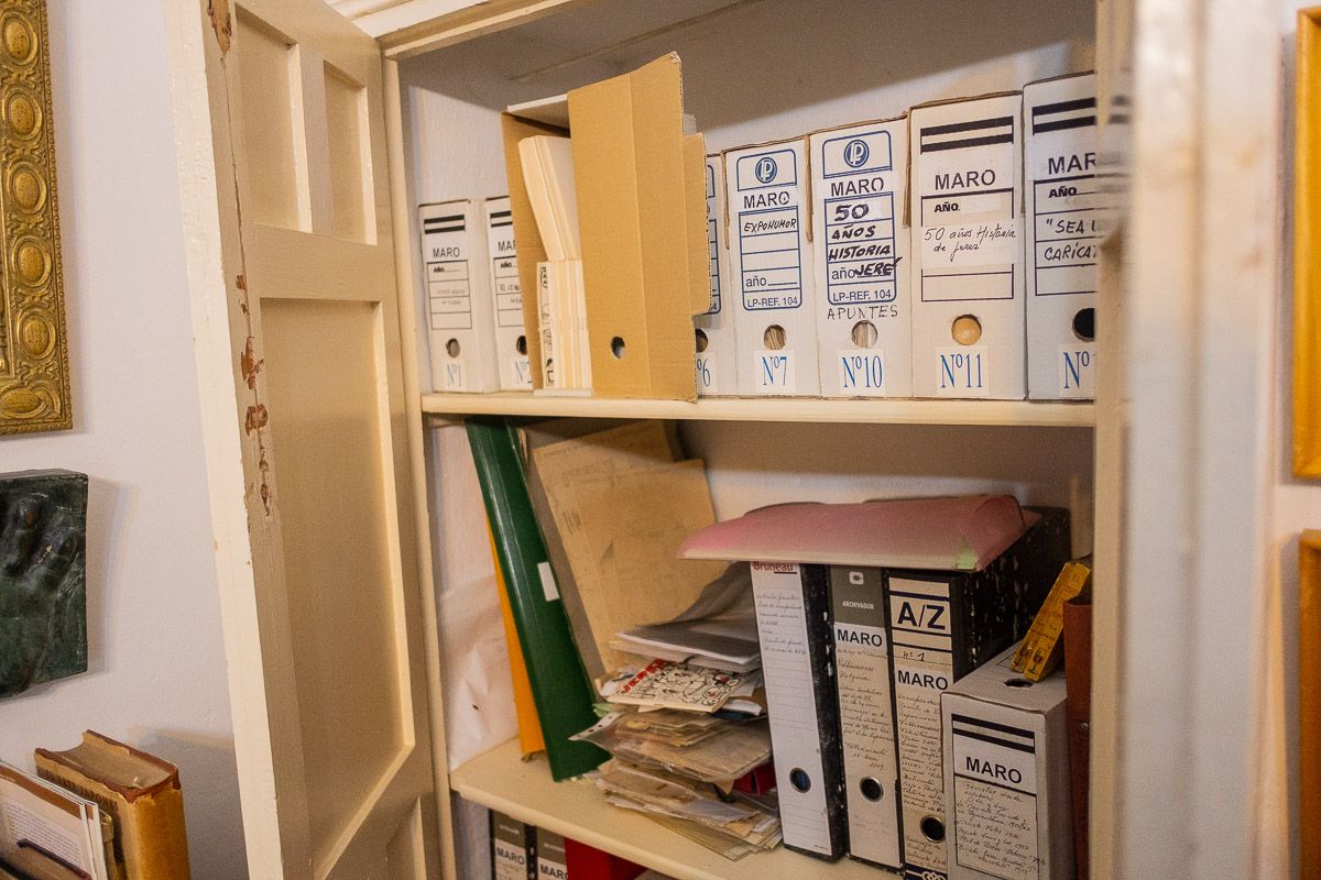 Su despacho se mantiene intacto. Una gran mesa lo preside. En ella, lápices, carpetas y un folio con viñetas de su célebre personaje Paco el parao, como si estuvieran recién dibujadas. Las estanterías que la rodea están llenas de libros y, en una de ellas, hay en torno a 60 carpetas con sus viñetas ordenadas por meses. Unas 300 por trimestre. Un cálculo rápido dan como resultado unos 18.000 dibujos, a los que hay que sumar los que aun quedan por catalogar, que están guardados en un armario situado en una esquina de la estancia. Unos 30.000 en total, según sus allegados. Y es que la carrera del humorista gráfico Manuel Rodríguez Romero, Maro (Jerez, 1934-2009), fue muy prolífica. “Estuvo dibujando hasta el día de su muerte”, cuenta su viuda, María del Carmen Ramírez, que abre las puertas de su casa a lavozdelsur.es.