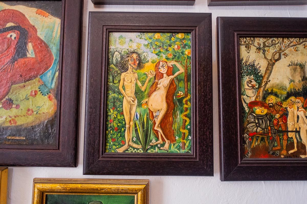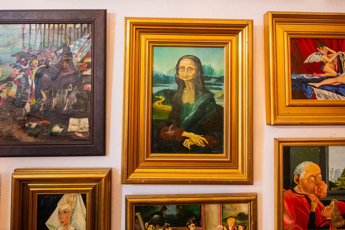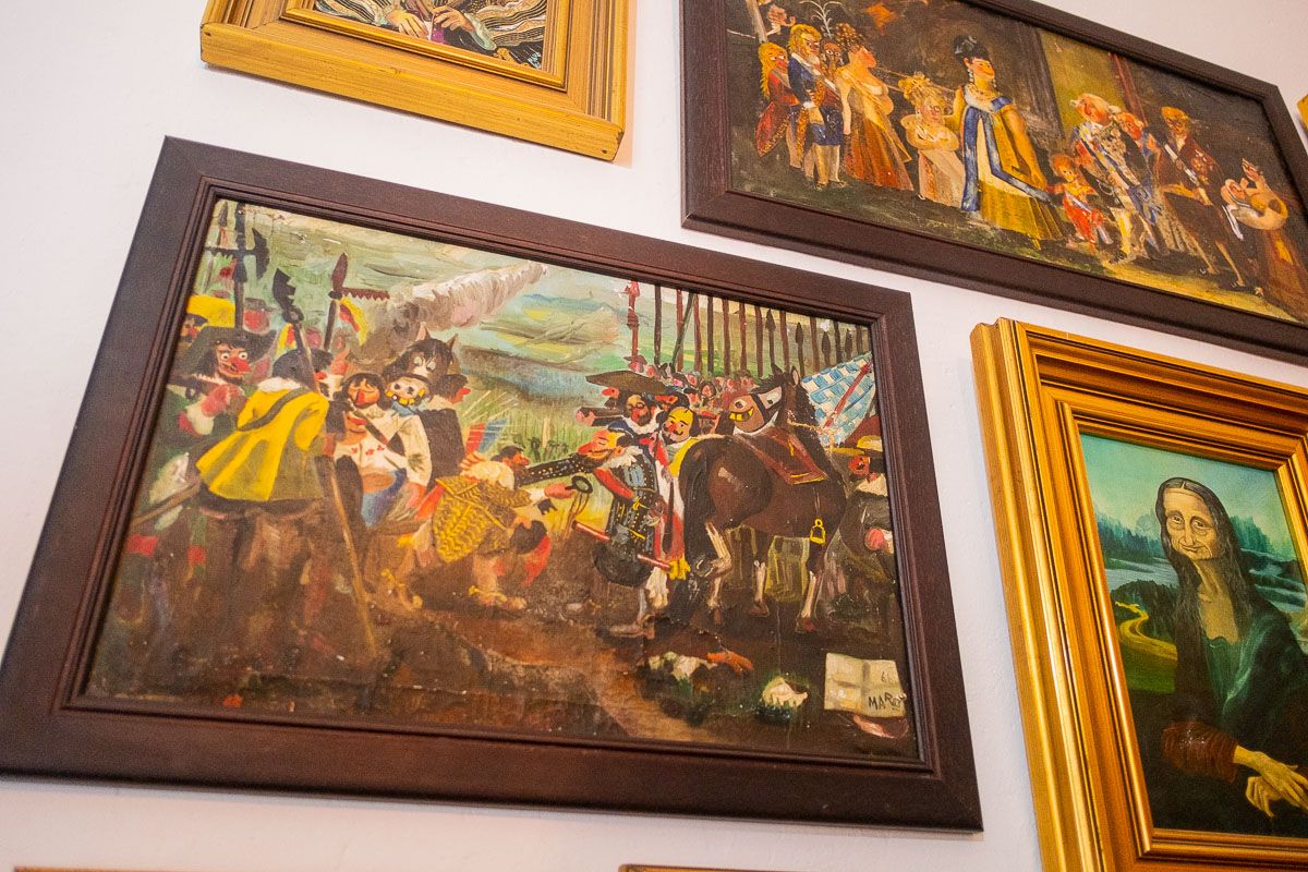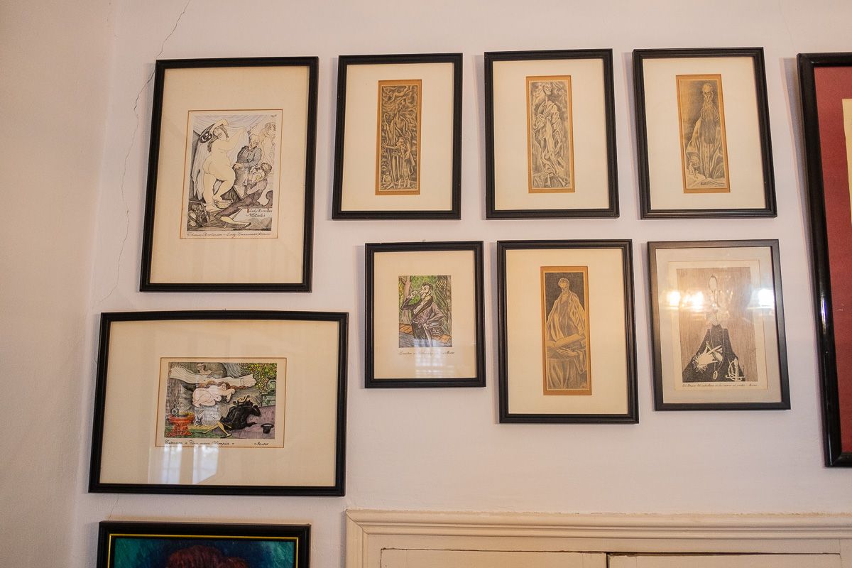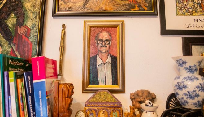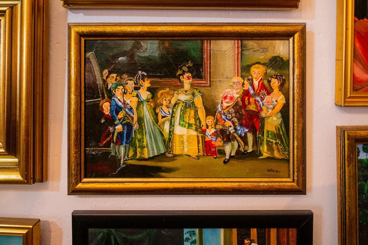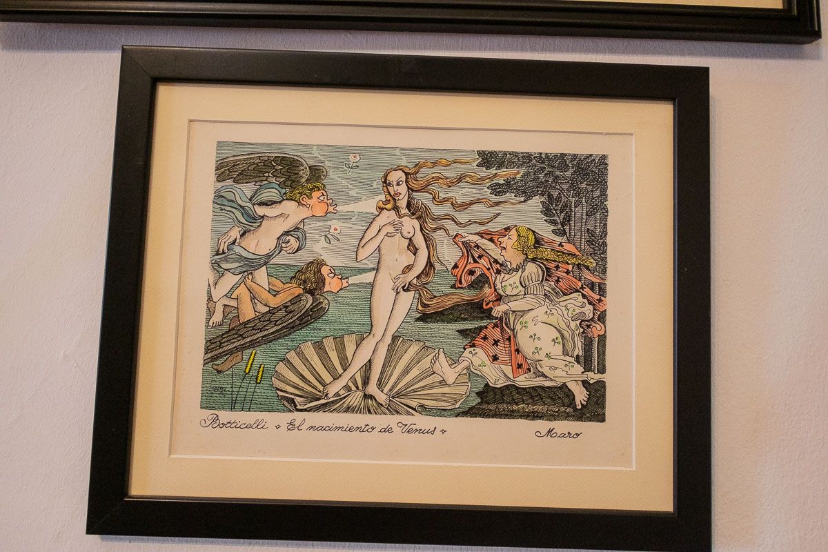 La viuda ejerce de anfitriona durante la visita de lavozdelsur.es a la casa donde Maro dio rienda suelta a su imaginación. Las paredes de las habitaciones de la que fuera su vivienda y lugar de trabajo están impregnadas de su arte. Además de viñetas, también pintaba cuadros, a los que aportaba su toque particular. Una Gioconda envejecida, llena de arrugas y con canas; La familia de Carlos IV (Goya) como si fueran personajes de cómics; La rendición de Breda (Velázquez) con más colorido y caras de guasa; o El nacimiento de Venus de Botticelli, tanto en tinta china como en acuarela; adornan diversas estancias de la casa en la que María del Carmen vive y sigue disfrutando del arte de su marido con solo mirar a su alrededor.