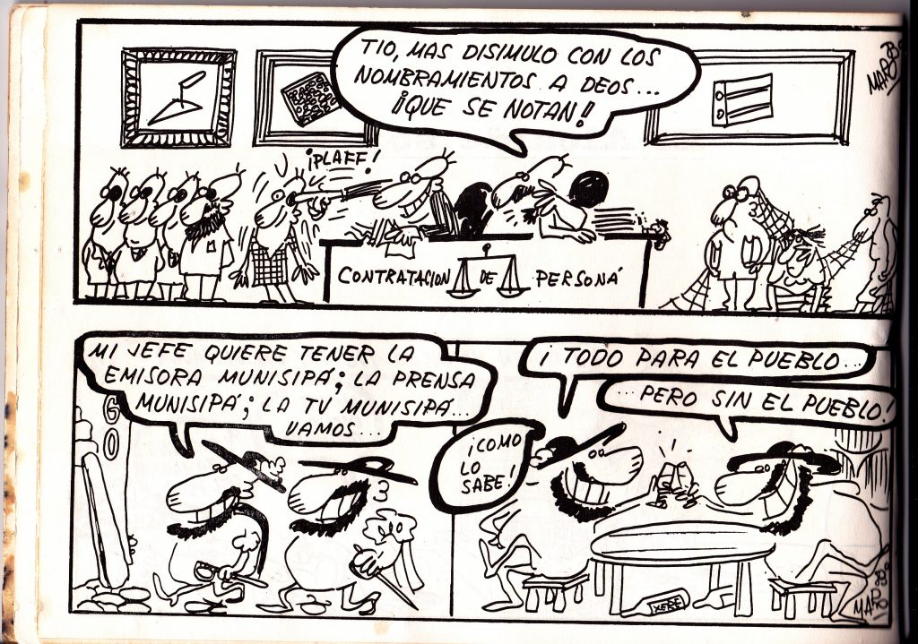 El exalcalde Pedro Pacheco era una de sus víctimas favoritas. “Tío, más disimulo con los nombramientos a deos, ¡que se notan!”, se lee en una de sus tiras, en la que se ve a un supuesto trabajador del departamento de “contratación de personá” del Ayuntamiento metiendo el dedo en el ojo a un hombre. “Esto no se hase, esto no se dise, ea, yo me marcho del Ayuntamiento”, dice un caricaturizado Pacheco mientras lee La Voz del Sur.