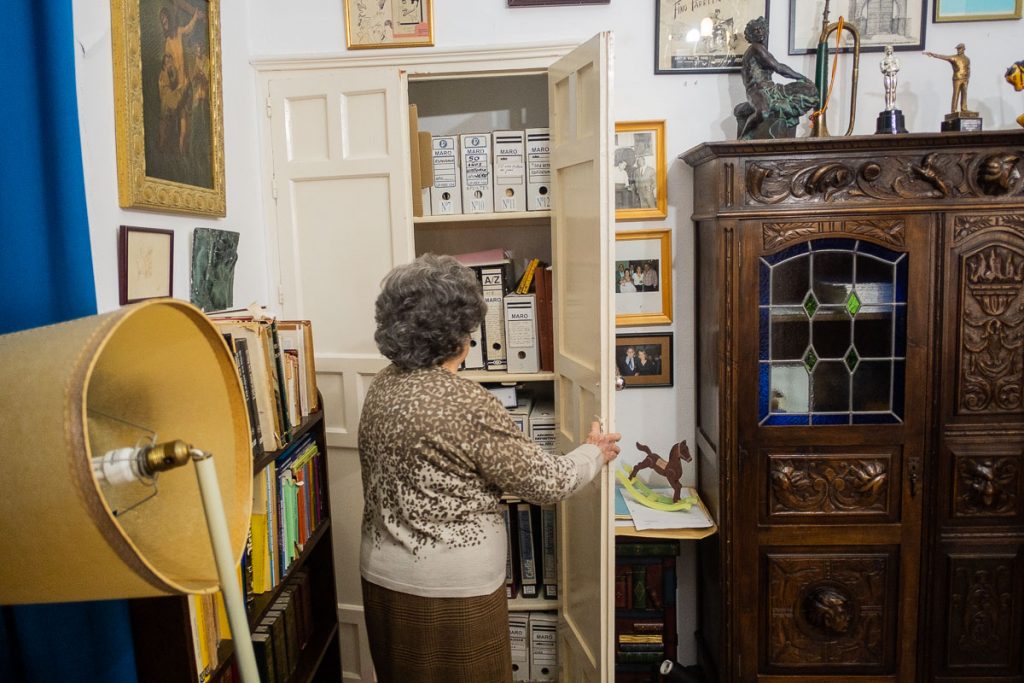 María del Carmen Ramírez, viuda de 'Maro', abriendo un armario donde conserva muchas de sus viñetas. FOTO: MANU GARCÍA