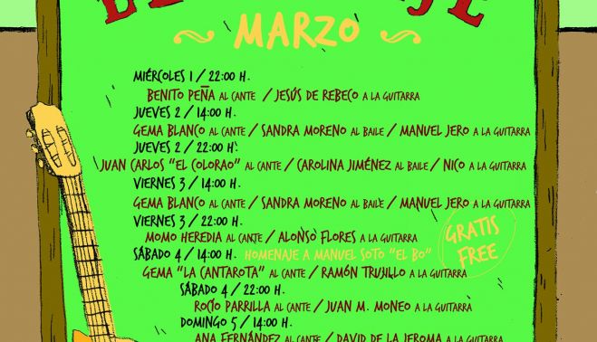 Marzo lo inaugurará el cante de Findu, el viernes 3 a las 22:00 horas. El sábado 4, a partir de las 15:00 horas, actuará Carmen Moncada al baile, con Juanillorro al cante y Alberto Franco al toque. Al día siguiente El Guitarrón acogerá su particular DenisJam, un encuentro de entrada y participación libre que abre sus puertas a la improvisación y que dará lugar a melodías únicas. El jueves 9 de marzo Juan Loreto, con su baile, acompañará el cante de Iván de Manuela Carpio y la guitarra de David de la Jeroma. La cita comenzará a las 22:00 horas. El viernes 10, sobre la misma hora, Bibi Núñez acompañará a María Martínez al cante, mientras José Manuel Alconchel se encarga de la guitarra. Por último, el programa cultural de El Guitarrón de San Pedro concluye con Almudena Navarro al baile, Paco Gasolina al cante y Manuel Heredia al toque.