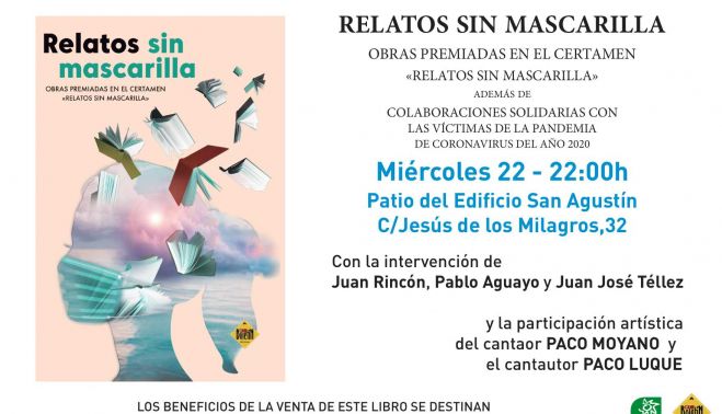 El patio del oficio San Agustín, situado en el número 32 de la calle Jesús de los Milagros de El Puerto, acoge este miércoles 22 de julio la presentación del libro Relatos sin mascarillas, un libro creado a partir de un certamen nacional de relatos cortos convocado en pleno confinamiento en el que participaron numerosos autores. La convocatoria fue un rotundo éxito de participación y calidad y el libro, además, contiene un buen número de colaboraciones solidarias de escritores que han enviado sus relatos para que fuese más redondo.