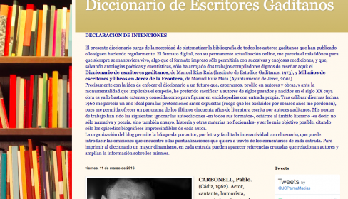 Para terminar, y más allá de los objetivos citados y de poner en valor la fértil cantera de escritores/as de la provincia de Cádiz, no podía dejar de mencionar las tres máximas ideológicas que han presidido y presiden la ejecución del Diccionario: evitar los comentarios subjetivos –la obra de cada autor/a debe hablar por sí misma-, descartar los autores/as que sólo han publicado autoeditándose, y, siendo fiel al carácter del blog, contemplar el ámbito de creación estrictamente literario en sus variados géneros.