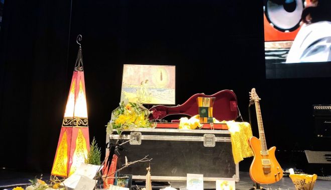 Son miles las personas congregadas en el Palacio de Congresos Roberto Iniesta de Plasencia para darle un último adiós a Robe. En el escenario, un altar con sus restos, su guitarra anaranjada, y dibujos, una pintura de Robe y otras que ha ido pintando en directo una amiga de la familia, además de dedicatorias de sus fans que han ido escribiendo durante la jornada. Y una foto suya, con su mujer, Bibi Vázquez, y sus dos hijos, desnudos en una isla mirando al horizonte.