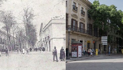 A día de hoy todo el mundo reconoce la calle Porvera por el frondoso manto con la que la cubre sus jacarandas. En la foto, de hace casi un siglo, conocida como Sagasta, se vislumbra su carácter urbano y su calzada, en estos tiempos concurrida más por vehículos a motor que por peatones.