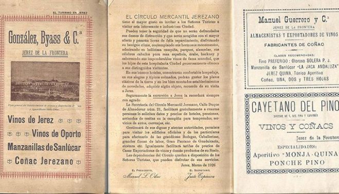 El Círculo Mercantil Jerezano tiene el mayor gusto en invitar a los Señores Turistas a visitar esta interesante e industriosa ciudad.Pueden tener la seguridad de que no serán defraudados sus deseos de distracción y que serán acogidos con el mayor afecto y pasarán horas de feliz esparcimiento, disfrutando su benigno clima, contemplando sus hermosos monumentos, admirando su bellísima campiña, parques, alamedas, sus célebres caballos pura raza española, árabe, hackney y saboreando sus imponderables vinos de fama mundial, que los hijos de esta hospitalaria Ciudad generosamente ofrecen a sus distinguidos visitantes.En sus buenos hoteles, encontrarán confortable hospedaje, en sus alegres y típicos colmados, podrán gustar los platos clásicos de la tierra y en los bien montados establecimientos de novedades, adquirir algún objeto, recuerdo de su visita a Jerez.Seguramente la excursión a Jerez la recordará siempre con agrado.La Secretaría del Círculo Mercantil Jerezano, Calle Duque de Almodóvar núm. 21, facilitará gratuitamente a cuantas personas lo soliciten datos y precios de hoteles, pensiones, arriendos de casitas en la campiña para temporadas, servicios de autos, carruajes, etc.Gestionará de sus dignas y atentas autoridades, permisos para visitar los edificios oficiales y de los particulares para efectuarlo de las grandiosas Bodegas, Caballerizas, grandes fincas de labor, Gran Pantano de Guadalcacín, etcétera. Igualmente facilitará tarifas de precios de Casas Exportadoras de vinos y demás productos de su Suelo.Las dependencias del Círculo quedan a disposición de los Señores Turistas, que pueden disfrutar de sus servicios.Jerez, Marzo de 1926.El Presidente, Manuel L. Olias.El Secretario, Justo Espinosa.Introducción de El Turismo en Jerez.