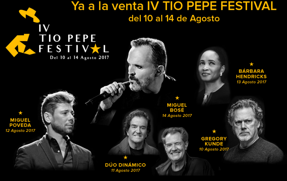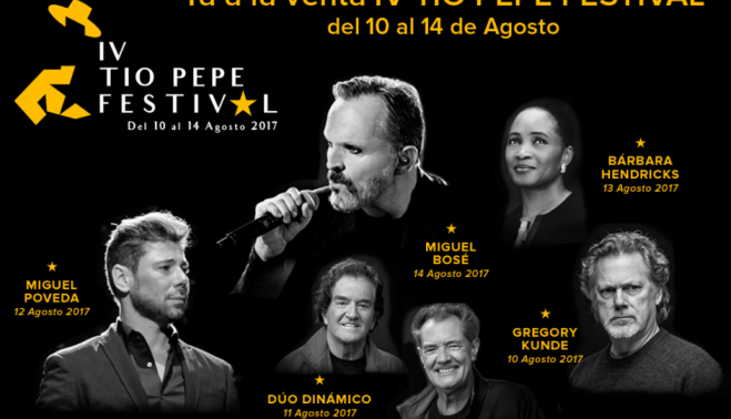 Miguel Poveda y Miguel Bosé son dos de las estrellas que protagonizarán el IV Tío Pepe Festival el próximo verano en Jerez. Un festival cultural, enológico y gastronómico que sigue creciendo edición tras edición y que acaba de poner sus entradas a la venta con una apuesta aún más ambiciosa. En esta ocasión, será cinco los días de programación con algunas de las estrellas más destacadas de la música pop, el flamenco y la lírica. Todo ello, con el inmejorable telón de fondo del conjunto bodeguero de González Byass en la ciudad. Entre los próximos 10 y 14 de agosto, la sede de la enseña vitivinícola volverá a convertirse en epicentro del verano musical de la provincia con los recitales de los dos mediáticos artistas españoles, a los que se suman los estadounidenses Barbara Hendricks y Gregory Kunde, y los veteranos pero muy populares Manolo y Ramón, que es lo mismo que decir el Dúo Dinámico.