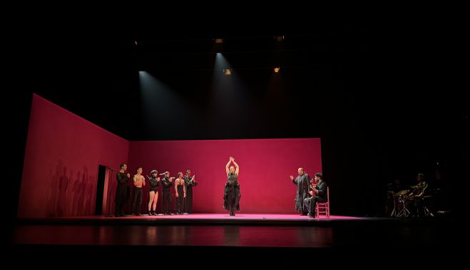 El telón asciende, como presagio a nuestro éxtasis, y la luz deja entrever, de luto negro y suspirando, a todo el elenco del espectáculo. Nada más y nada menos que 7 bailaores 7, 4 músicos en aparte y, la artista invitada, Mara Rey, de mantilla. Cual Bernarda Alba, la luz de Gloria Montesinos (AAI) ensombrece con su silueta y la de Liñan las paredes, que no son blancas, porque esta casa no es prisión más que del corazón, y todo se tiñe de un rosa intenso, del fuego atardecer a los violáceos. Eros y Tánatos, el eterno tropo. Pero en este caso la muerte es de gozo, de belleza, Muerta de Amor.