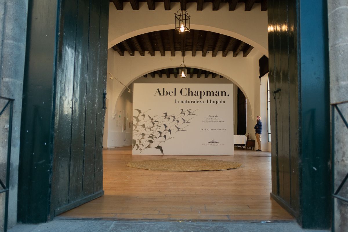 Además de un centenar de dibujos (lápiz, tinta, clarión sobre papel y acuarela), la exposición contiene fotografías, libros, documentos, aves disecadas y cañones pateros. Al lado de los dibujos hay textos explicativos. Gracias a ellos el visitante sabrá quién fue el aventurero Abel Chapman. Nació en 1851 en Bishopwearmouth (Inglaterra). Desde niño mostró una gran pasión por los viajes y la naturaleza. Estudió en la prestigiosa Rugby School, donde conoció al aventurero Frederick Selous, que le contagió su amor por los viajes. Adquirió la casa de campo de Houxty, su residencia hasta su muerte en 1929. En 1897 vendió la empresa familiar, dedicada a la fabricación de cervezas y al comercio de vinos por tierra y por mar, para dedicarse a la caza, los viajes y al estudio de la naturaleza. Sus exploraciones transcurrieron entre el Océano Ártico y el cabo de Buena Esperanza. Los datos que recogía, incluso ejemplares disecados, los enviaba a los museos de Historia Natural. Así llegó a España. Tuvo residencia en Jerez, la de su amigo Walter J. Buck en el Recreo de las Cadenas, lo que le permitió conocer a fondo El Coto, la Campiña y la Sierra de Grazalema. Con Buck escribió sus dos obras arriba mencionadas. Gracias a estos trabajos conocemos cómo era nuestro entorno natural peninsular y jerezano hace cien años.