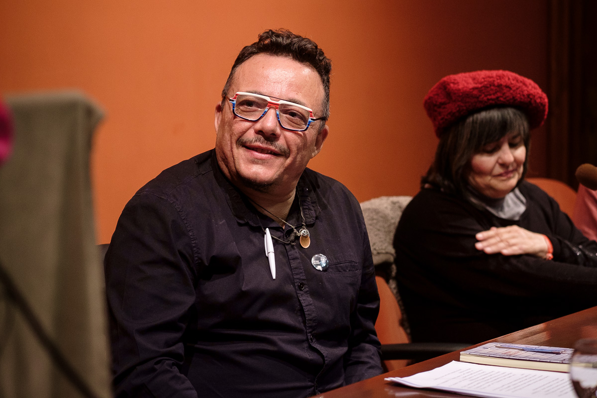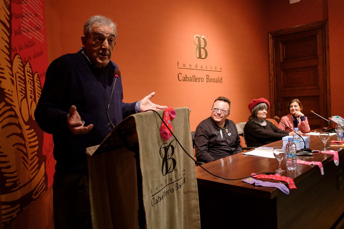 Antonio Miguel Morales nos explicó que “Calcetines Impares comenzó a fraguarse en mis últimos años de instituto y en mis primeros años de Universidad, en torno a revistas como Cuarto Creciente o Número”. Recordó aquellos tiempos creativos, de amistad y poesía, en los que se reunían en la biblioteca. Los responsables les dejaban las llaves, y allí “se bebían los libros”. De aquella época son los poemas de Naranjas de la China. Eran versos irreverentes e íntimos, impregnados de lo personal y lo social. Para Antonio hay valores que son esenciales, como la solidaridad y la justicia, de ahí que no hayan abandonado nunca su escritura. Hay poemas centrados en el otro, “en los nadie que diría Eduardo Galeano”. Y tampoco olvida que somos homo ludens: “A la hora de escribir no me gusta dejar al lado el juego, esa actividad libre que nos aparta de lo cotidiano, de lo rutinario”. Fue leyendo poemas que el público extraía del interior de los calcetines que decoraban la mesa…