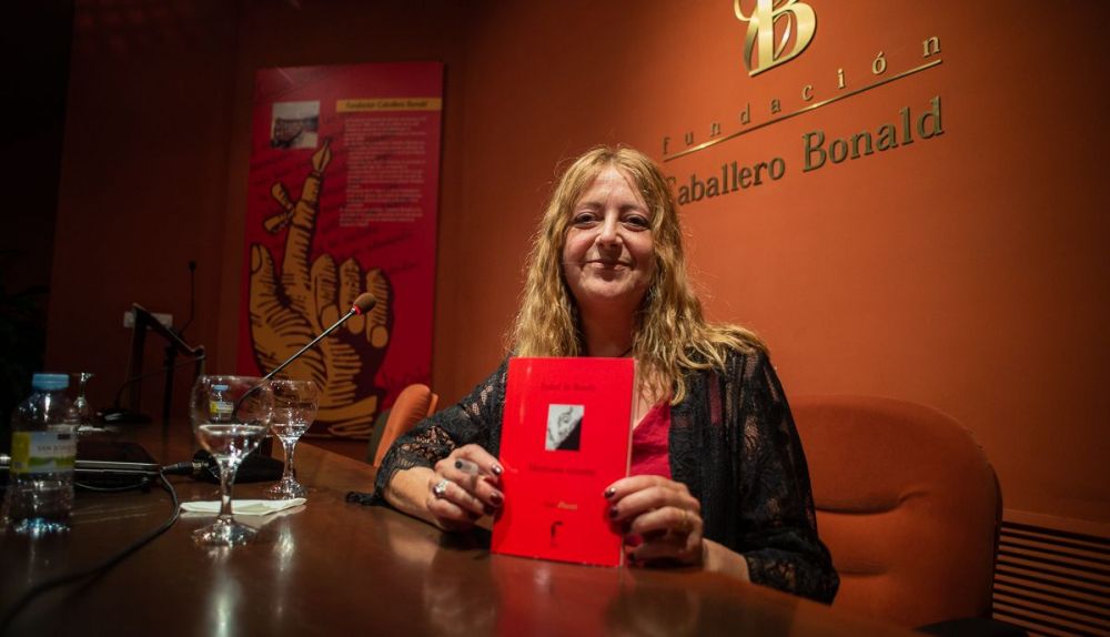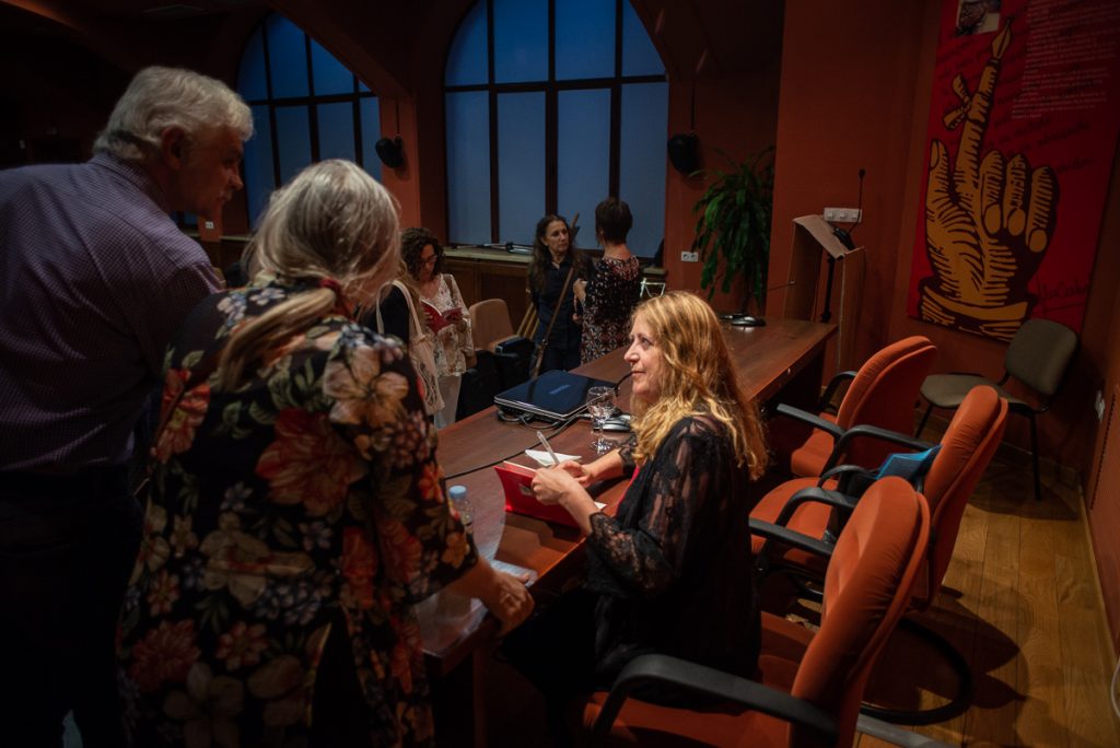 A pesar de haber publicado ya varios libros, Isabel de Rueda reconoció sentirse “como una novia, feliz pero un poco asustada”. Nos leyó varios poemas de cada parte del poemario. Empieza el libro con un prefacio metapoético y una cita de Pessoa. “Los primeros poemas son de extensión corta y de carácter meditativo, reflexivos, algunos con cierto halo de angustia existencial”, aclaró la escritora. La Esfinge representa el enigma en el que estamos envueltos los humanos desde que nacemos: “Las personas somos islas, nacemos solos y morimos solos.” Los poemas tratan temas como el silencio, la memoria, el fracaso, la transexualidad, el vértigo y el miedo. La segunda parte del libro comienza con una cita de Cernuda, uno de los poetas que más ha influido a Isabel. “En esta parte el amor se manifiesta en sus diferentes vertientes”. También hay un poema dedicado a la ciudad de Chauen. Y es que este libro ha ido tomando forma a lo largo de varios años. No hubo un plan inicial para esta obra. La tercera parte comienza con una cita de Ángel González. El otoño es metáfora de la muerte, no solo de la biológica, sino de aquella que se refiere al fin de un ciclo. Hay poemas dedicados al maltrato machista. Otros hablan de nuestras abuelas y los tiempos que tuvieron que vivir. Otro trata de la decepción…
