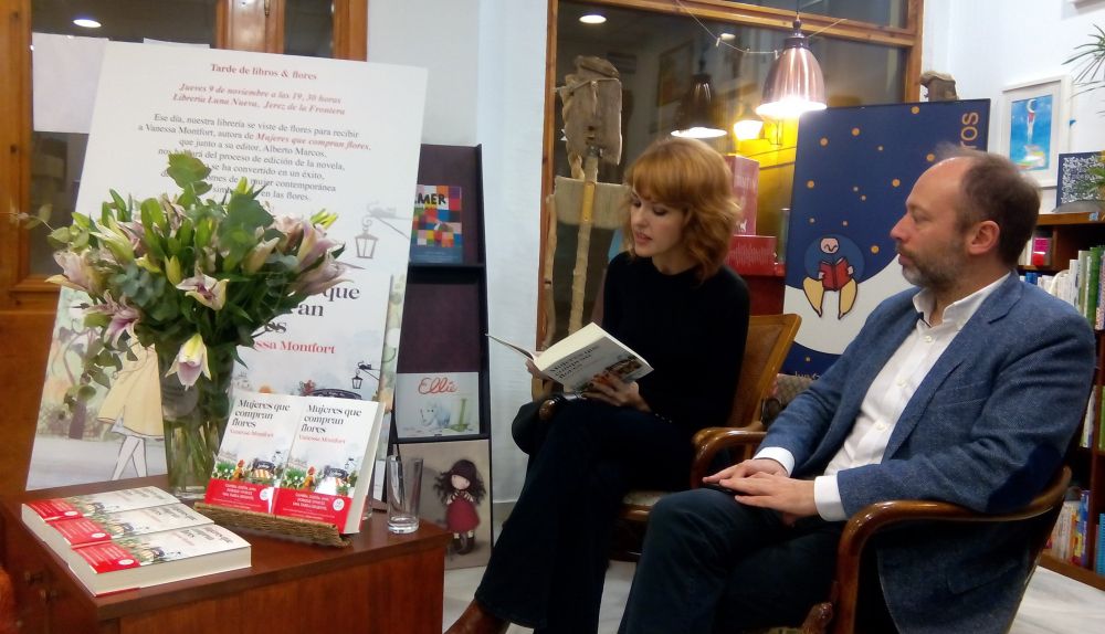 La tarde del jueves las flores invadieron la librería La Luna Nueva. Vanessa Montfort, novelista y dramaturga, acudió a presentarnos Mujeres que compran flores, una obra editada por Plaza y Janés. Estuvo acompañada por su editor, Alberto Marcos, con el que dialogó de forma desenfadada y divertida sobre los aspectos más relevantes del libro. No dejaron ningún cabo suelto. Gracias al dominio de todas las técnicas de comunicación, y a la experiencia acumulada, lograron atrapar a los lectores presentes.