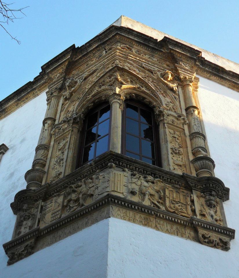 Esta ventana está situada en una esquina y su distribución es simétrica a ambos lados. Ubicada sobre un entablamento cuyo arquitrabe presenta en el extremo izquierdo una ménsula formada por dos seres fantásticos enfrentados que sostiene una cartela en la que está escrita la fecha de 1537. Sobre el arquitrabe encontramos una banda de gotas y sobre este un friso en cuyo centro se alternan dos ángeles y tres blasones que corresponderían a la casa de Villavicencio-Zurita, Ponce de León y de la Cueva. Los extremos de este friso vemos dos cuadros que enmarcan unas columnas formadas por querubines. El vano doble de la ventana está enmarcado por un arco de medio punto sostenido por columnillas corintias y el conjunto de la ventana está flanqueado por columnas.