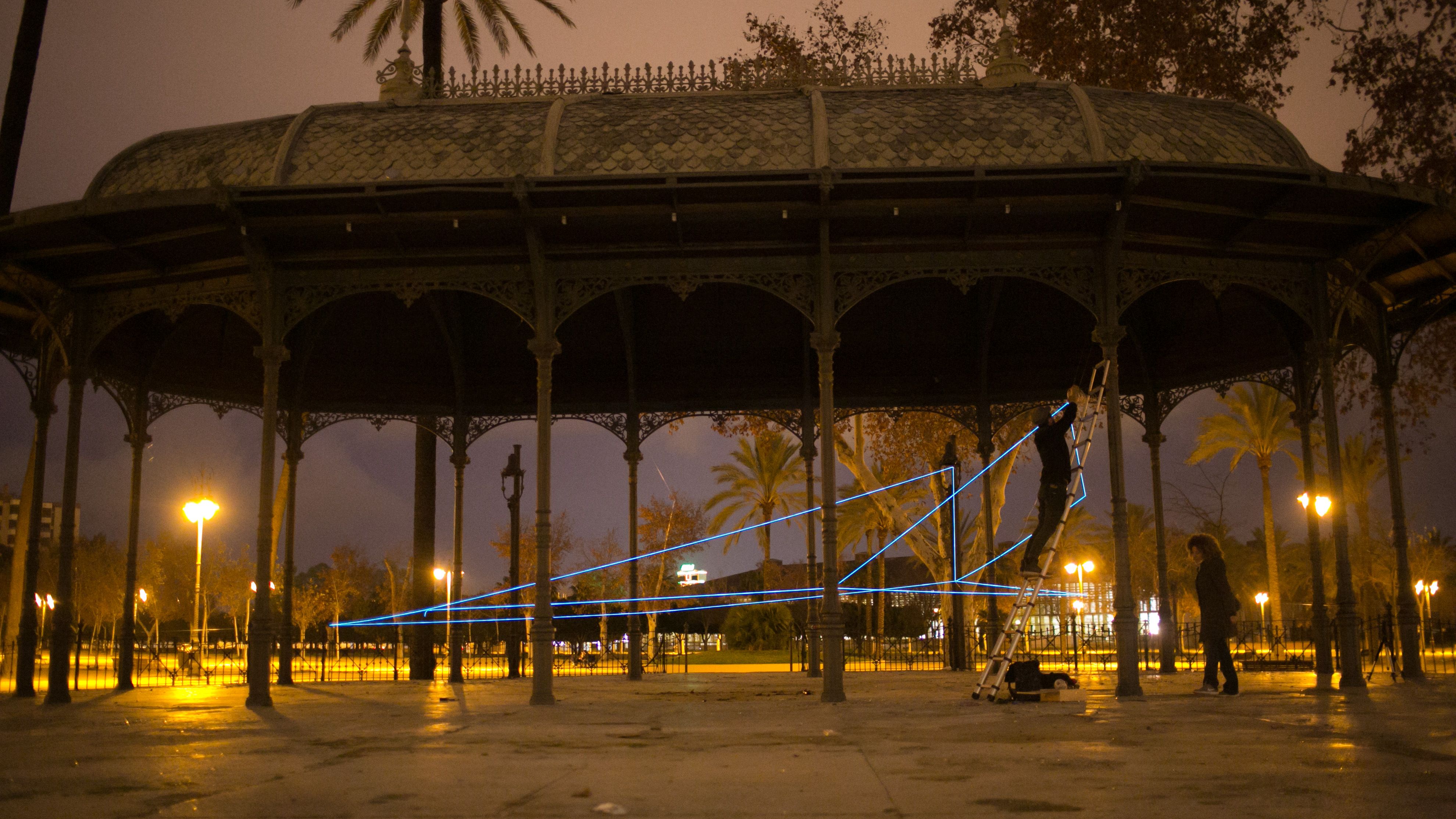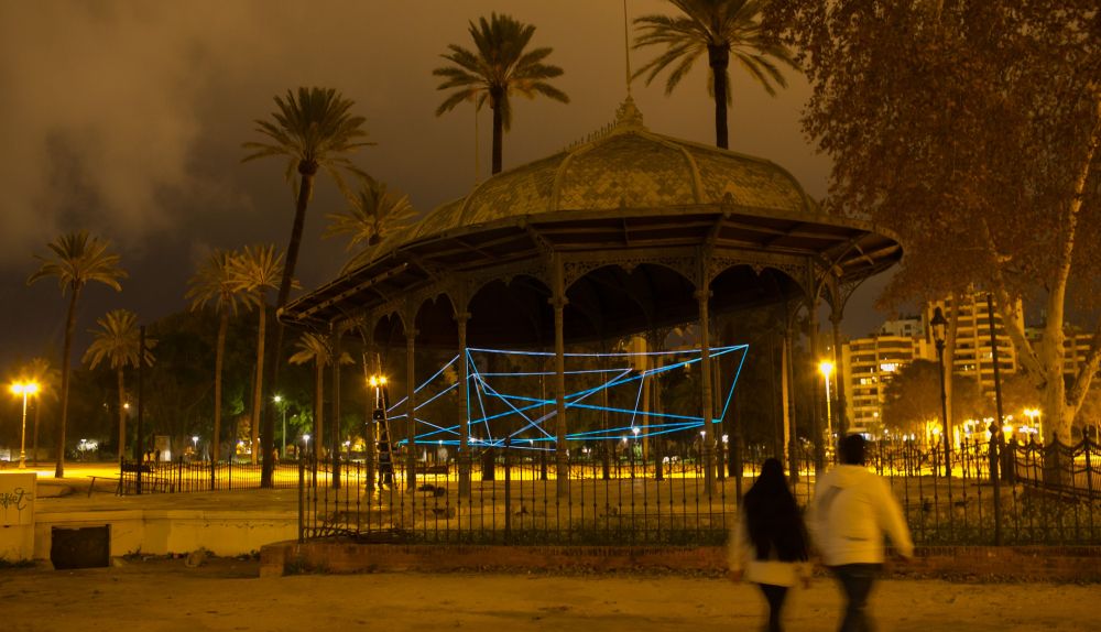 “Acabo de aterrizar en el nido. Empiezo a preparar el puchero para cuando RA se duerma”. Es el mensaje SMS de Spidertag a uno de sus colaboradores, antes de ponerse a tejer con sus líneas de neón en uno de los templetes del jerezano parque González Hontoria. La obra de este artista urbano, cuyo año de nacimiento y lugar de procedencia es “información confidencial de súper héroe”, empieza a tomar forma en cuanto la luz del día cae por completo y el parque empieza a iluminarse con el tenue alumbrado público.