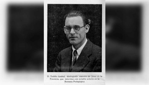 Este año se cumplen además cien años de su llegada a Jerez en octubre de 1925. En esa fecha llegaba a nuestra ciudad procedente de una escuela pública de Madrid un joven y entusiasta maestro de apenas 31 años nacido en Fuentelespino de Haro, un pequeño pueblo de la provincia de Cuenca, acompañado de su esposa, Evencia Pascual Achutegui, y de su hija Matilde, una pequeña de tres años a quien la generosa tierra de Jerez habría de acoger prematuramente a causa de la fatalidad de una grave enfermedad, cuando apenas tenía 14 años. Teófilo había solicitado destino en Jerez por motivos de salud, obteniendo, por permuta, una plaza como maestro de sección en la entonces llamada escuela Graduada de Niños nº 1 “Carmen Benítez”, enclavada en el conocido barrio de Santiago.