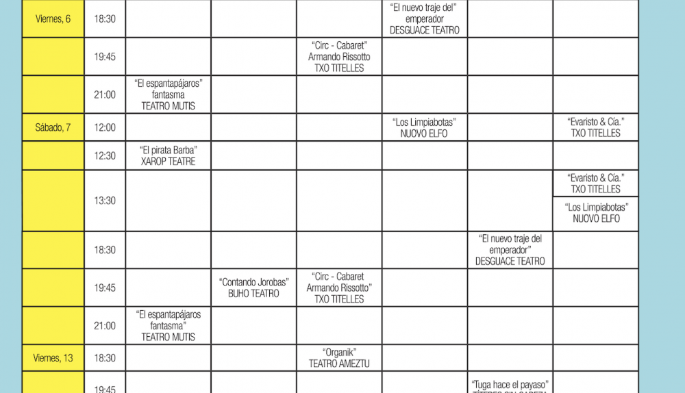 Por otro lado, los integrantes de la compañía Txo Titelles desde Cataluña llevarán a cabo Circo - Cabaret Armando Risotto; Xapop Teatre con su obra El pirata Barba llegan desde la Comunidad Valenciana; Nuovo Elfo con Los Limpiabotas y El barrendero desde Francia e Italia. Así como, desde Aragón y con la obra Tuga hace el payaso la compañía de Títeres Sin Cabeza. Asimismo subirán a las tablas el Teatro Mutis con El espantapájaros fantasma desde Castilla y León, Panta Rhei con Corre payasa, corre y Teatro Ameztu Organik del País Vasco.