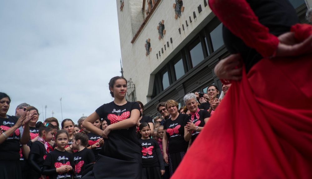 Sacar el escenario a la calle, esa ha sido la idea de Marian Jiménez, la bailaora jerezana criada entre las calles Nueva y Ponce, "donde hay mucha gitanería y mucho arte", que ha llevado a cabo el tradicional flashmob flamenco que se celebra con motivo de la celebración en la ciudad del Festival de Flamenco. Coincidiendo además con el Día de Andalucía, la artista ha querido hacer un homenaje a su tierra con la ayuda de sus alumnas. Gesto, que tanto los conciudadanos como los turistas le han agradecido con una enorme acogida y ovación. La plaza Romero Martínez, frente al Villamarta, se ha abarrotado media hora antes de que el espectáculo diera el pistoletazo de salida. "¡Vente pal flashmob!", se ha podido escuchar desde la calle Honda durante la espera.