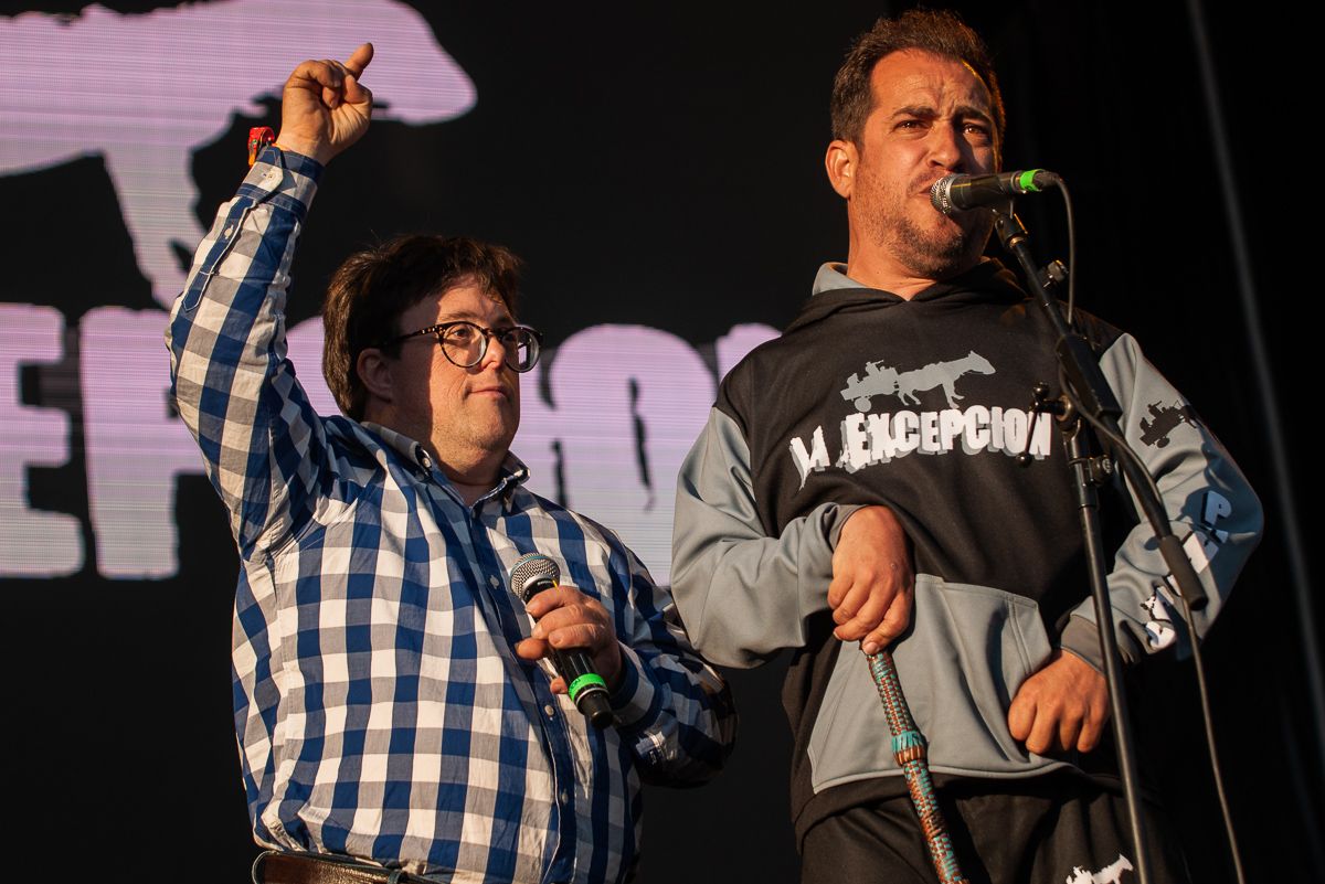 Pablo Pineda junto a El Langui en el Primavera Trompetera. FOTO: MANU GARCÍA.Tras hacer mención a los b-boys, los raperos españoles de la "vieja escuela": SFDK, Tote King, Rapsusklei, El Chojin, Violadores del Verso, Kase.O..., el rapero Ignacio José Fornés, conocido como 'Nach', dijo: "La música es lo que nos une. Eso es puta magia". Para, segundos después, denunciar lo que nos separa: "Pararle los pies a esos hijos de puta machistas, xenófobos, homófobos, racistas..., para tener un entorno mejor. No reírles las gracias". Y una vez superado el reto de las canciones cantadas a una sola vocal, Nach se marcha y el público poco a poco se desplaza hacia el escenario Alegría. Llega el momento del gaditano con voz rasgada que toca "flamenco-underground".