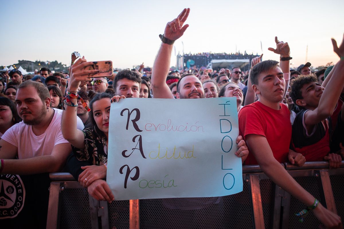 Mala Rodríguez rapeando en el Trompetera. FOTO: MANU GARCÍA.Cual Carmen Sandiego o azafata de Tío Pepe, la reina del rap español se presenta de manera ofensiva contra el machismo. Primero, sororidad. Aparece acompañada de mujeres, con un cuadro de bailarinas para empezar la actuación cantándole a "mis gitanas". Segundo, ataque. Con bate en mano, la jerezana rapea a viva voz letras contra el sexismo y el clasismo que discrimina a las mujeres. "Tengo un trato, lo mío pa mi saco", canta contoneándose con twerking a ratos. En su tierra, María Rodríguez, conocida como La Mala, no hace más que agradecer a su gente todo el amor que le demuestra en cada concierto. "Te quiero a ti, a ti, a ti, a ti también", dice señalando a todos los de la primera fila antes de cantar Contigo, su último tema sobre dos enamorados. Pasión, amor, sensualidad, besos... ¿Qué quedará para el resto del festival?