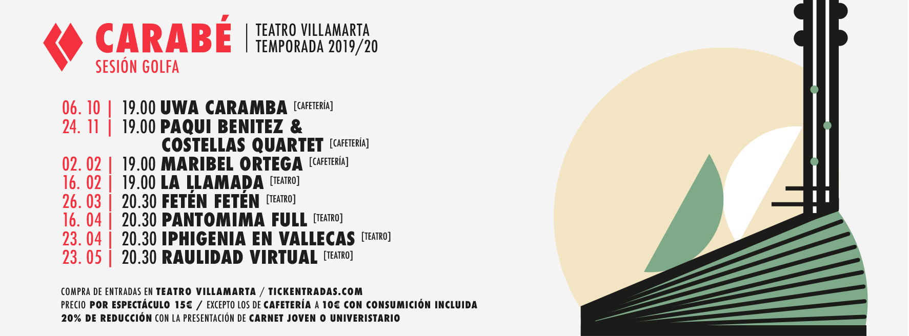 Desde este domingo y hasta el 23 de mayo del año próximo, Carabé ocupará tres escenarios diferentes dentro del Villamarta, y ofrecerá un 20% de descuentos en las entradas para espectadores con carné joven o universitario que quieran asistir a espectáculos como el musical La llamada, ideado por los populares Javis, o al show de Pantomima Full, un dúo humorístico compuesto por Rober Bodegas y Alberto Casado, un fenómeno viral en redes sociales. Con el objetivo de incrementar la oferta del Villamarta y diversificarla de cara a un público diferente, la programación, con entradas ya a la venta a 15 euros y 10 euros con consumición en los shows en cafetería, tiene "un claro guiño al público millenial, la generación Y, que comprende un público entre los 22-23 años a los 40. Un colectivo diverso, y como consecuencia de ello, esta propuesta de programación: diversa, fresca, moderna y diferente".