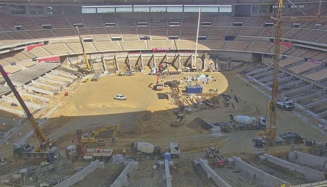 Actualmente, ya han concluido los trabajos de cimentación y, en pocos días, también se habrán terminado los trabajos sobre la estructura —que están a más del 90% de ejecución—, lo que supone un adelanto de diez días respecto al cronograma. Asimismo, se están colocando las primeras gradas originales, que fueron desmontadas previamente y, una vez realizada esta tarea, se procederá a la colocación paulatina del resto de graderío.
