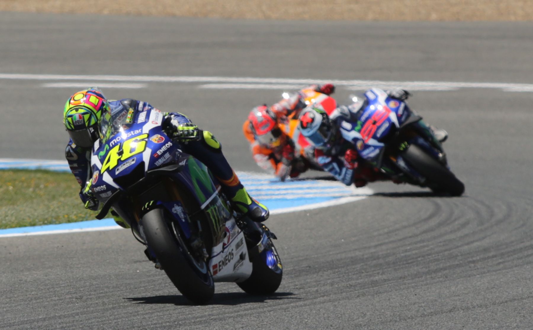 Pero si hubo un circuito talismán para él ese fue el Circuito de Jerez, donde consiguió nueve victorias (7 en la categoría reina, uno en el cuarto del litro y otro en la menor de las categorías), siendo el piloto que más triunfos ha logrado. Su relación con el trazado jerezano siempre fue muy especial. A continuación recordamos cinco de sus grandes triunfos en Jerez.
