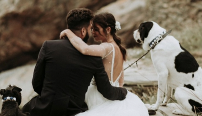 En una puede vérseles subidos al capó de un coche vestidos de novios y sosteniendo un bote de humo azul presentando ambos una sonrisa de oreja a oreja y en otra abrazados junto a dos perros frente al mar.