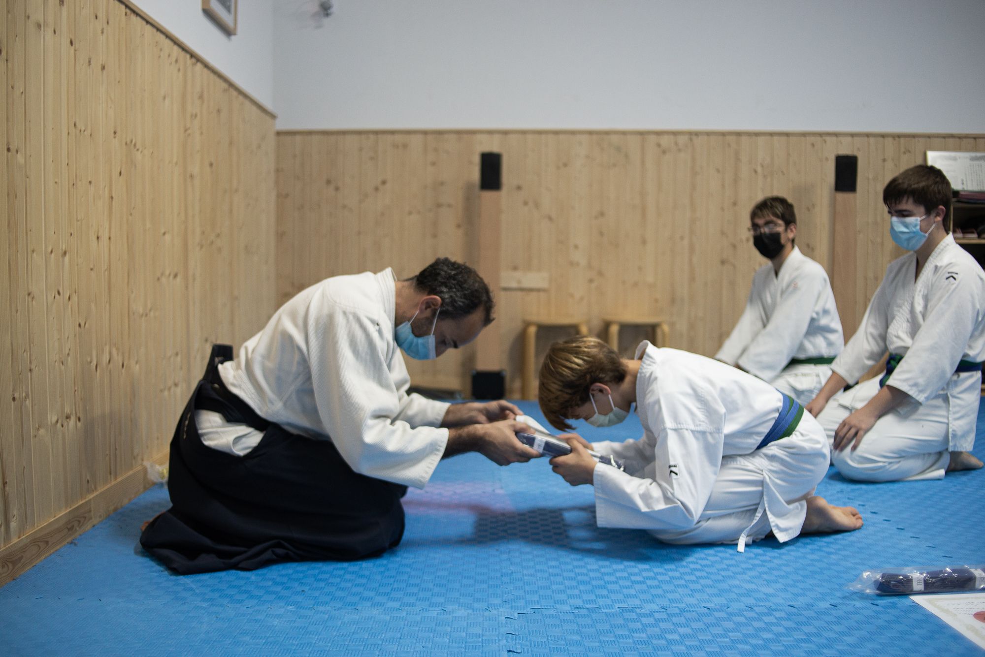 Una tarde cualquiera algunos jóvenes han logrado pasar de nivel y recogen sus diplomas y cinturones correspondientes. “El aikido es el único arte marcial donde no hay competición, hay que encontrar la motivación, pequeños objetivos para seguir adelante”, comenta Iván mientras muestra algunos recuerdos como el reconocimiento de su asociación que le envió la embajada japonesa.