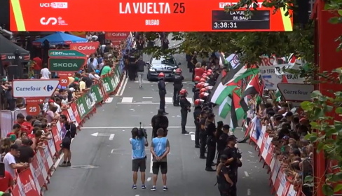 El incidente comenzó antes de la salida neutralizada, cuando algunos aficionados interrumpieron temporalmente el paso del pelotón con pancartas a favor de Palestina. Tras unos segundos, la carrera continuó, aunque con una etapa marcada por la tensión y la incertidumbre.