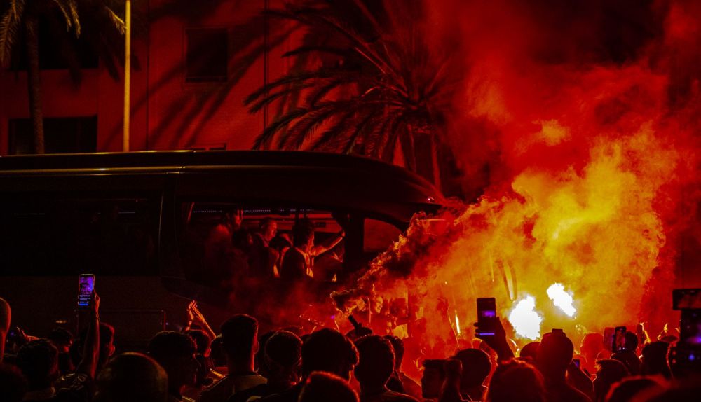 La llegada de los jugadores, a poco de irrumpir el alba, ha sido un estallido en Puerta de Tierra, donde numerosos aficionados se han llevado concentrados y de fiesta casi toda la pasada noche. Una vez han bajado del autobús, los jugadores y el cuerpo técnico se han sumado a unas celebraciones que a buen seguro se prolongarán en el día de hoy.